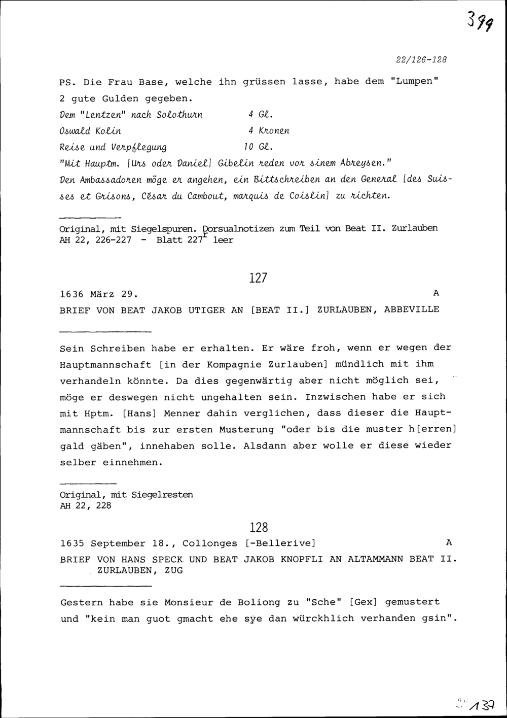 Schreiben von Beat Jakob Utiger an Beat II. Zurlauben, Abbeville