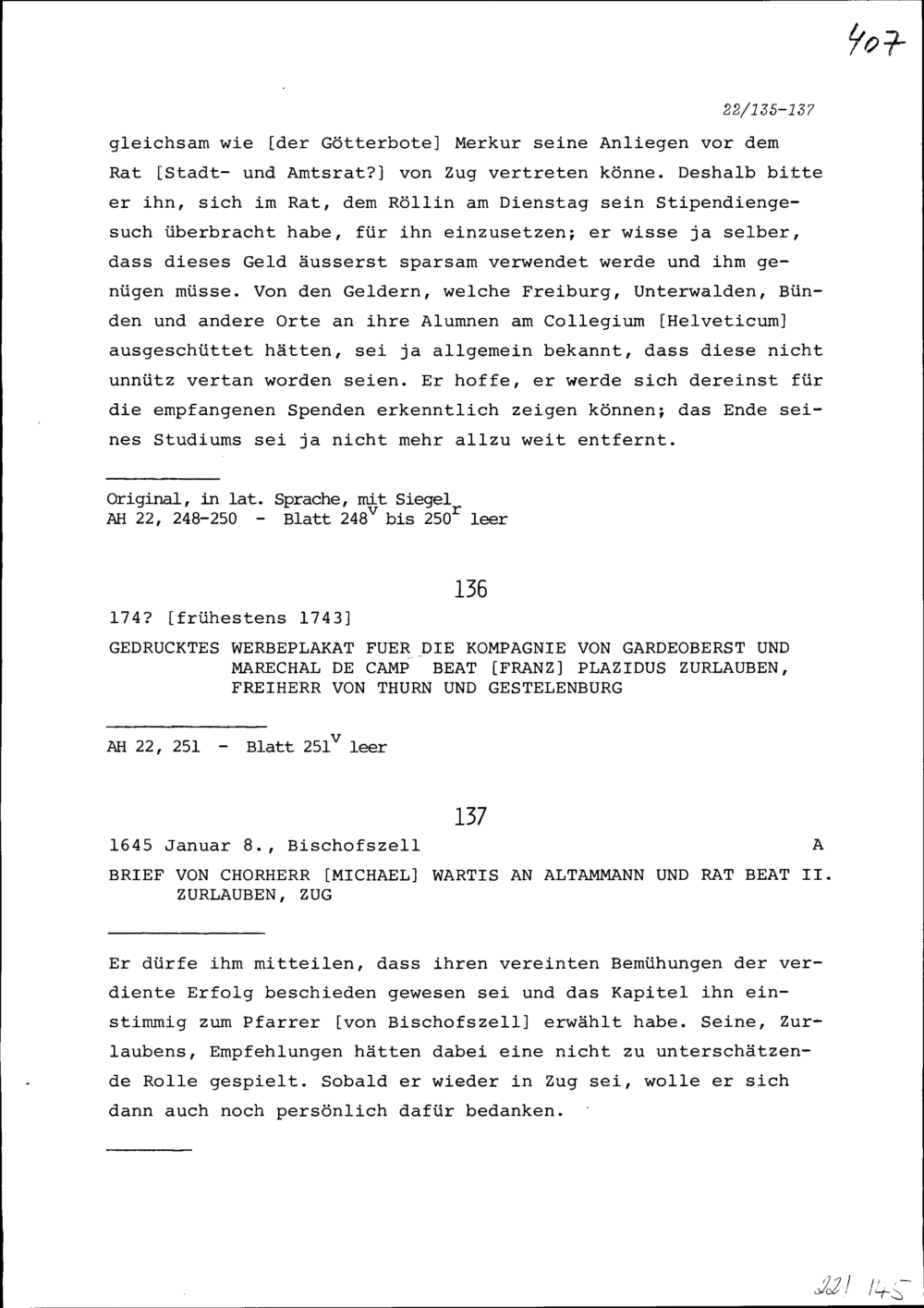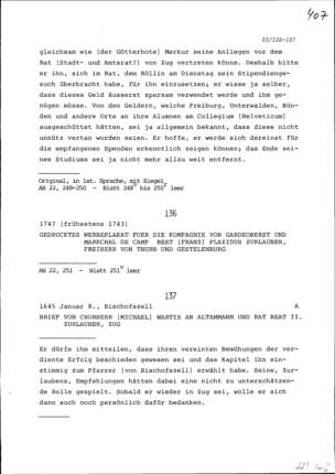 Druck: Werbeplakat für die Kompanie von Beat Franz Plazidus Zurlauben, Gardeoberst und Feldmarschall