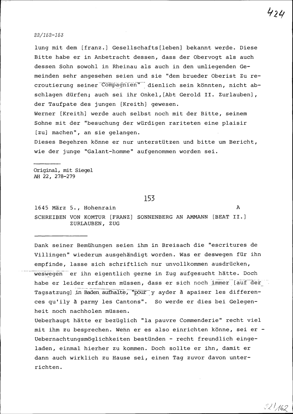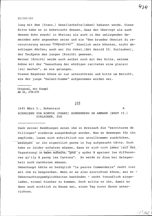 Schreiben von Franz Sonnenberg, Komtur, an Beat II. Zurlauben, Ammann, Zug