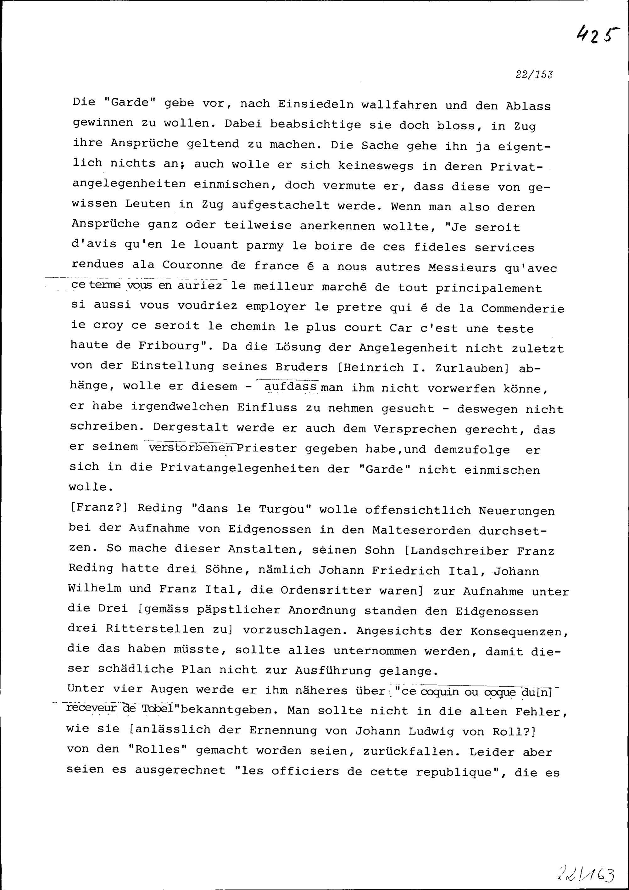 Schreiben von Franz Sonnenberg, Komtur, an Beat II. Zurlauben, Ammann, Zug