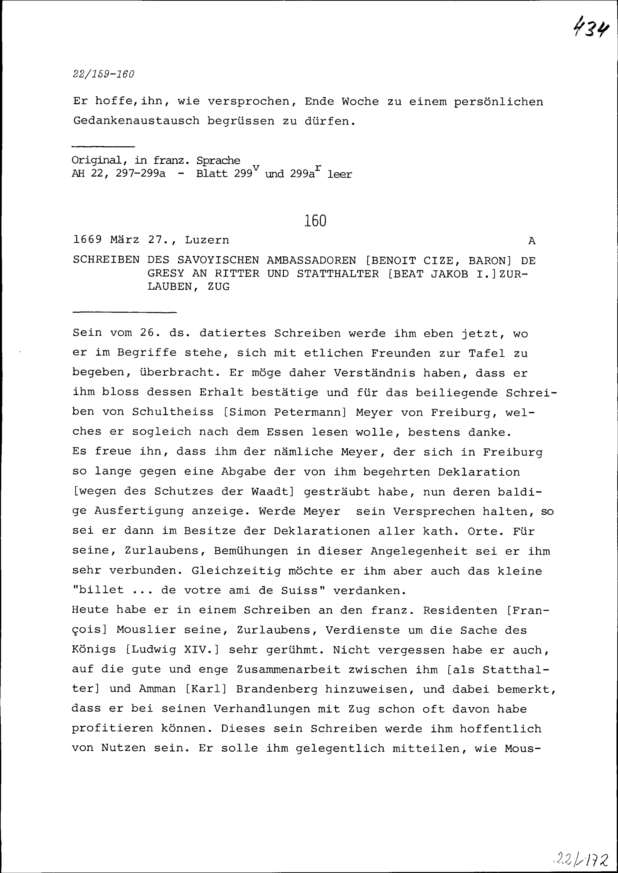 Schreiben von Benoît II. Cize, Baron de Grésy, Ambassador von Savoyen, an Beat Jakob...