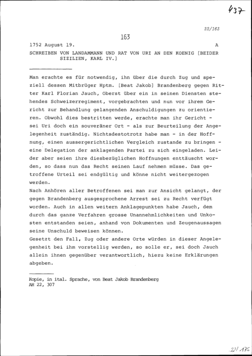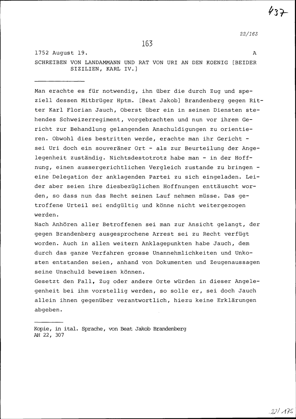 Schreiben des Landammanns und Rats Uri an Karl IV., König beider Sizilien
