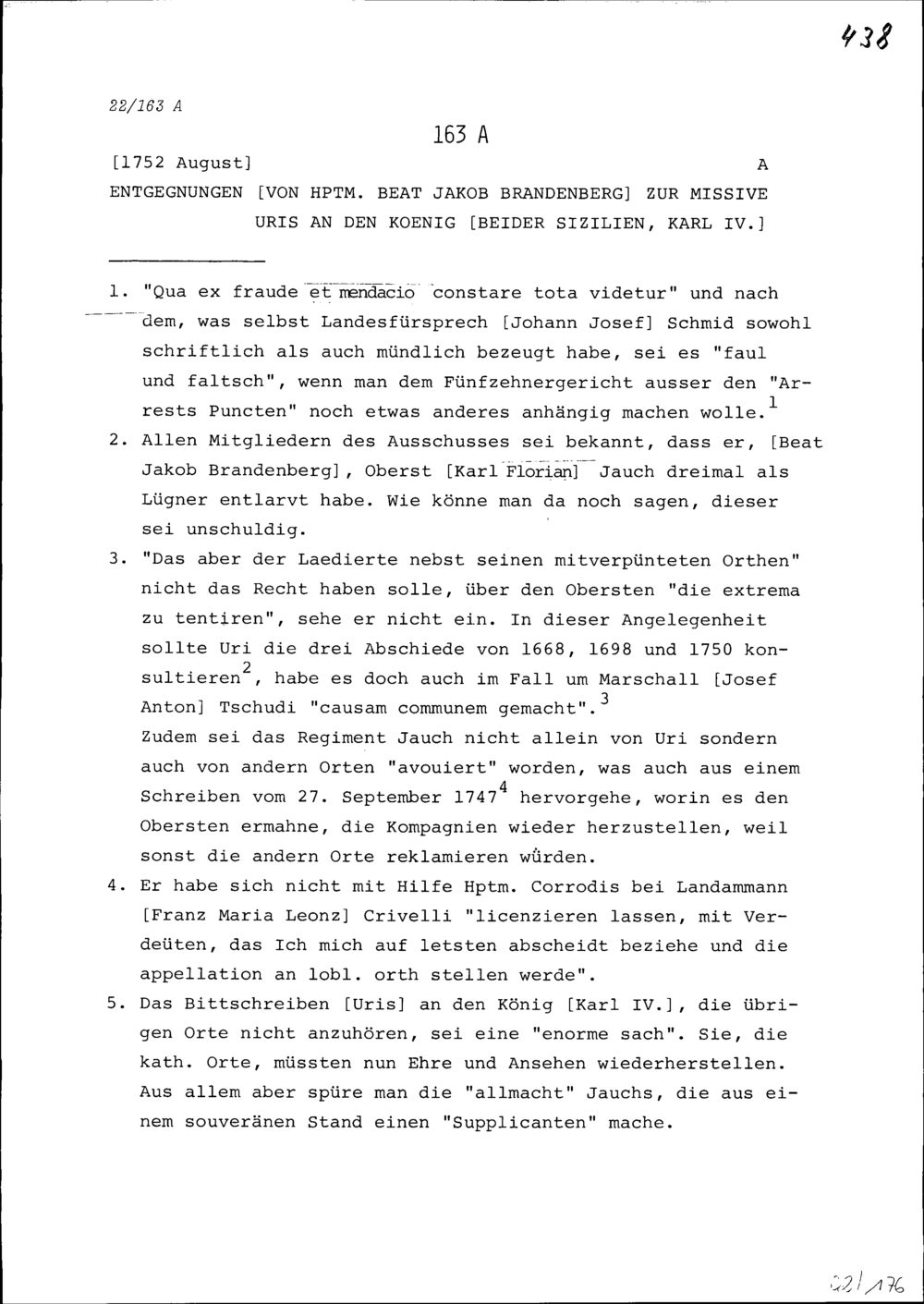 Entgegnungen von Beat Jakob Brandenberg, Hauptmann, zur Missive Uris an Karl IV., König beider Sizilien
