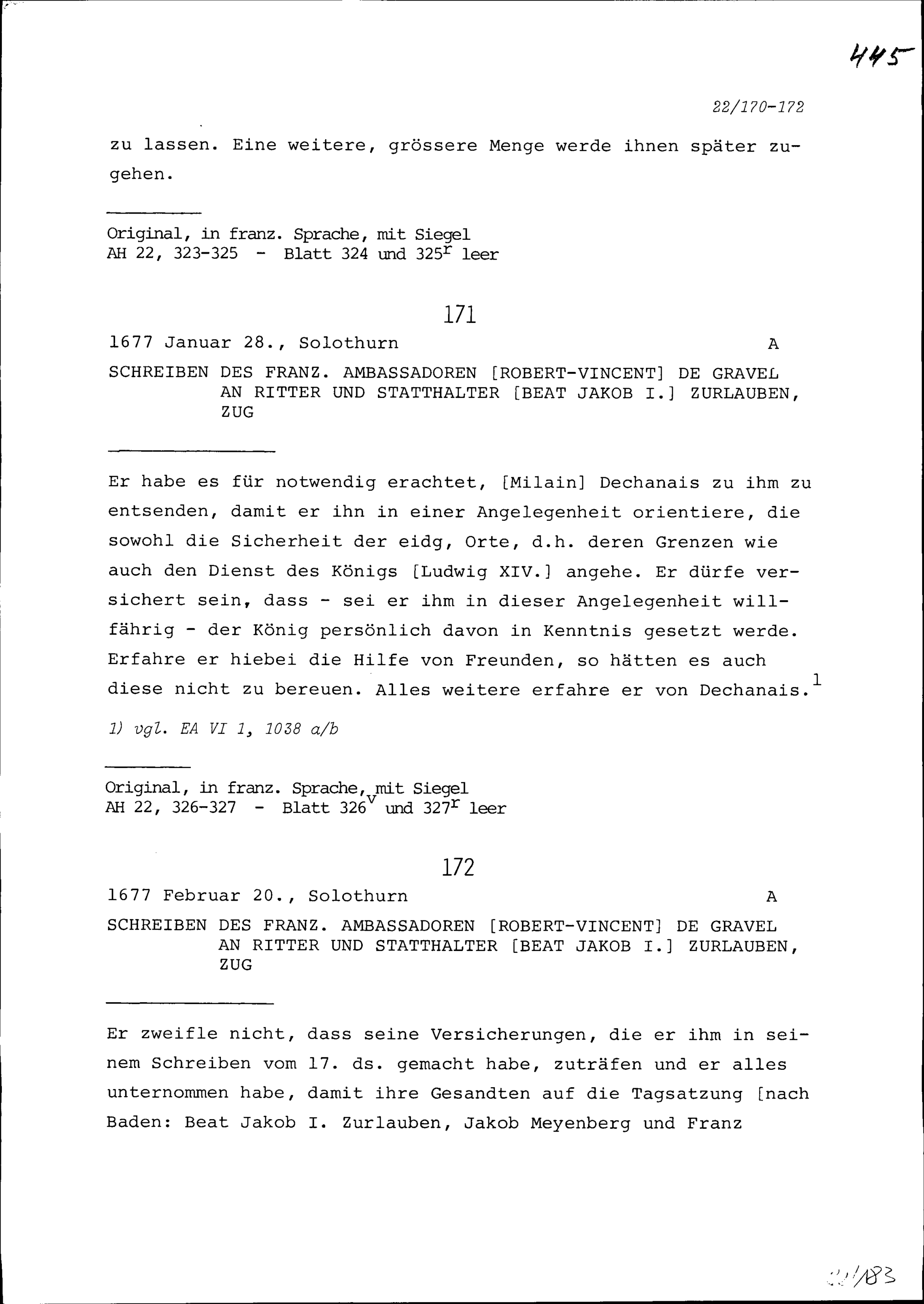 Schreiben von Robert-Vincent de Gravel, Ambassador von Frankreich, an Beat Jakob I. Zurlauben, Statthalter, Zug