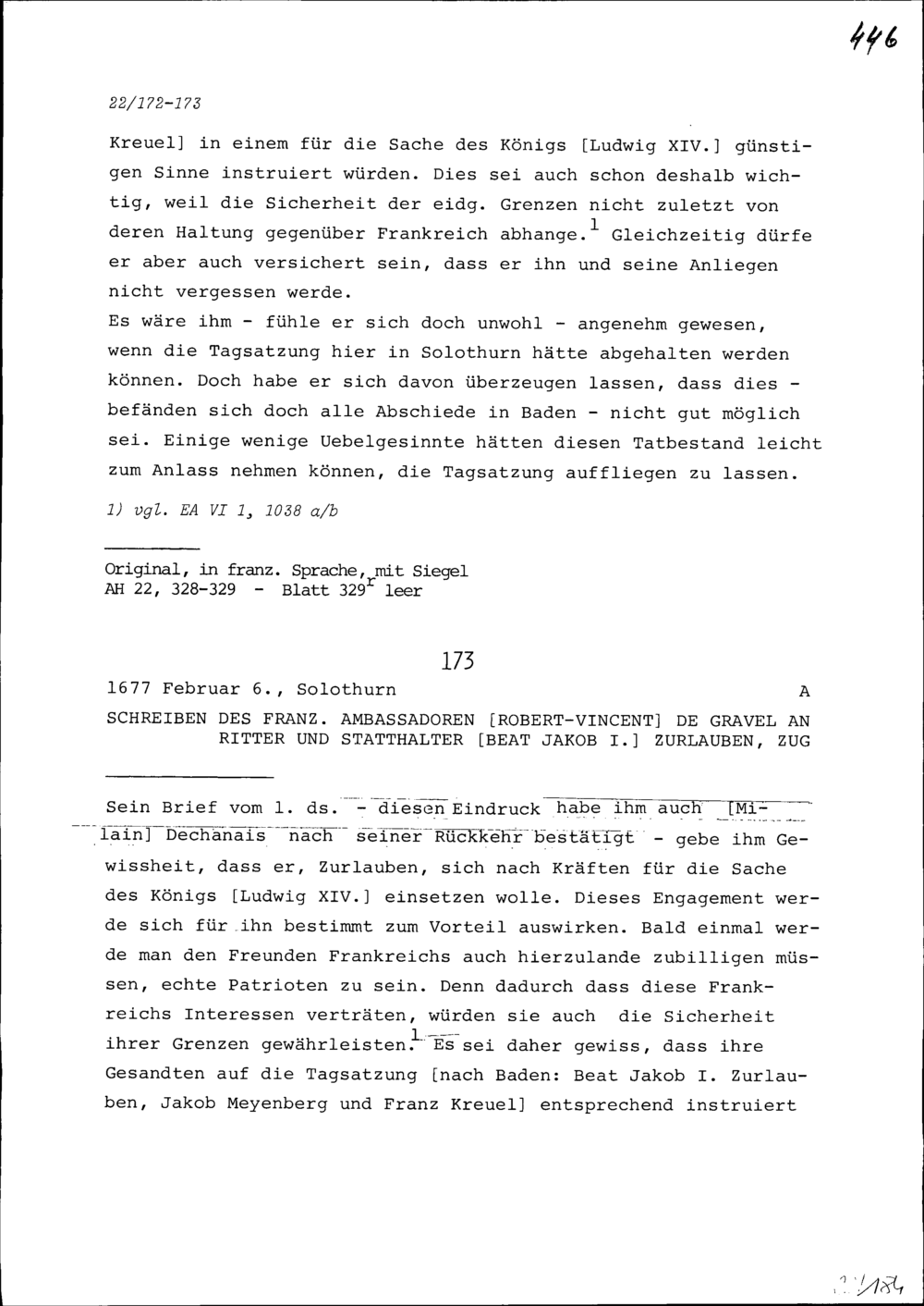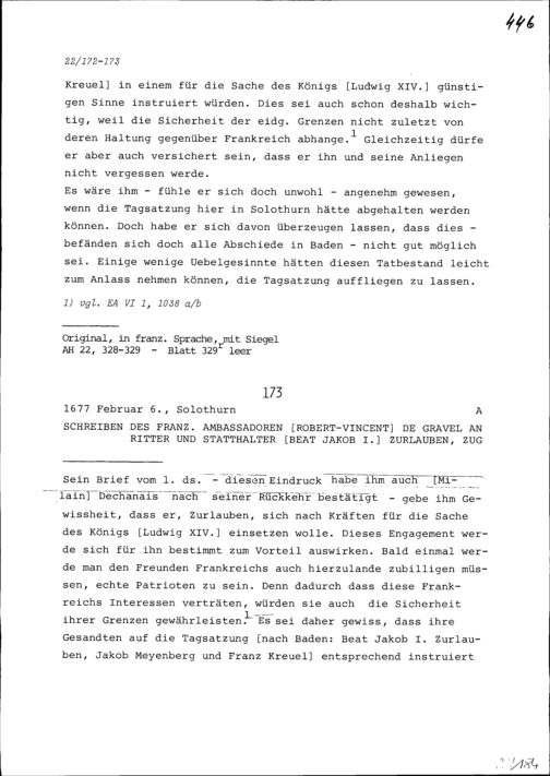 Schreiben von Robert-Vincent de Gravel, Ambassador von Frankreich, an Beat Jakob I. Zurlauben, Statthalter, Zug
