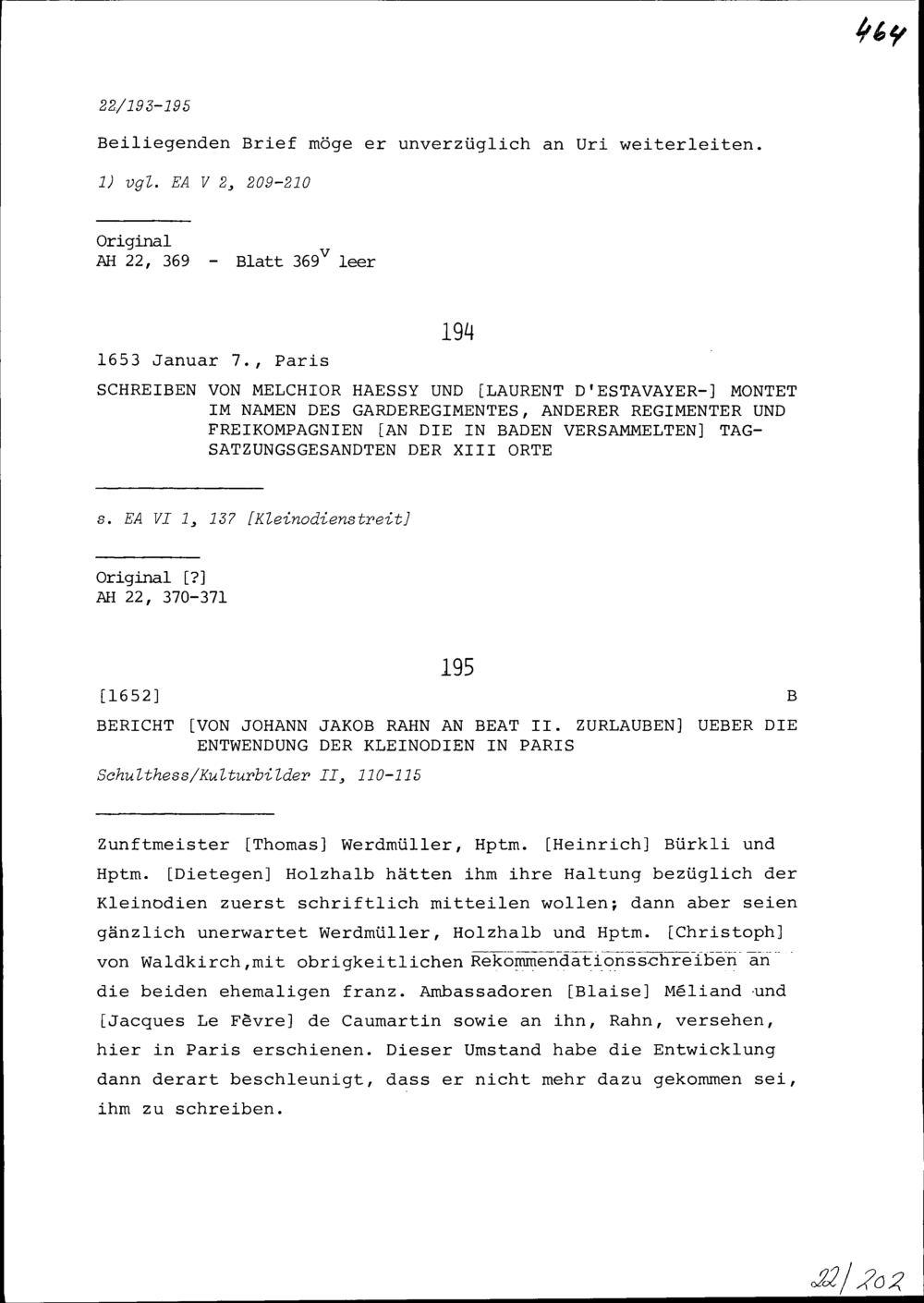 Schreiben von Melchior Hässy und Laurent d'Estavayer-Montet im Namen des Garderegiments, anderer Regimenter und Freikompanien an die Tagsatzungsgesandten der Dreizehn Orte in Baden
