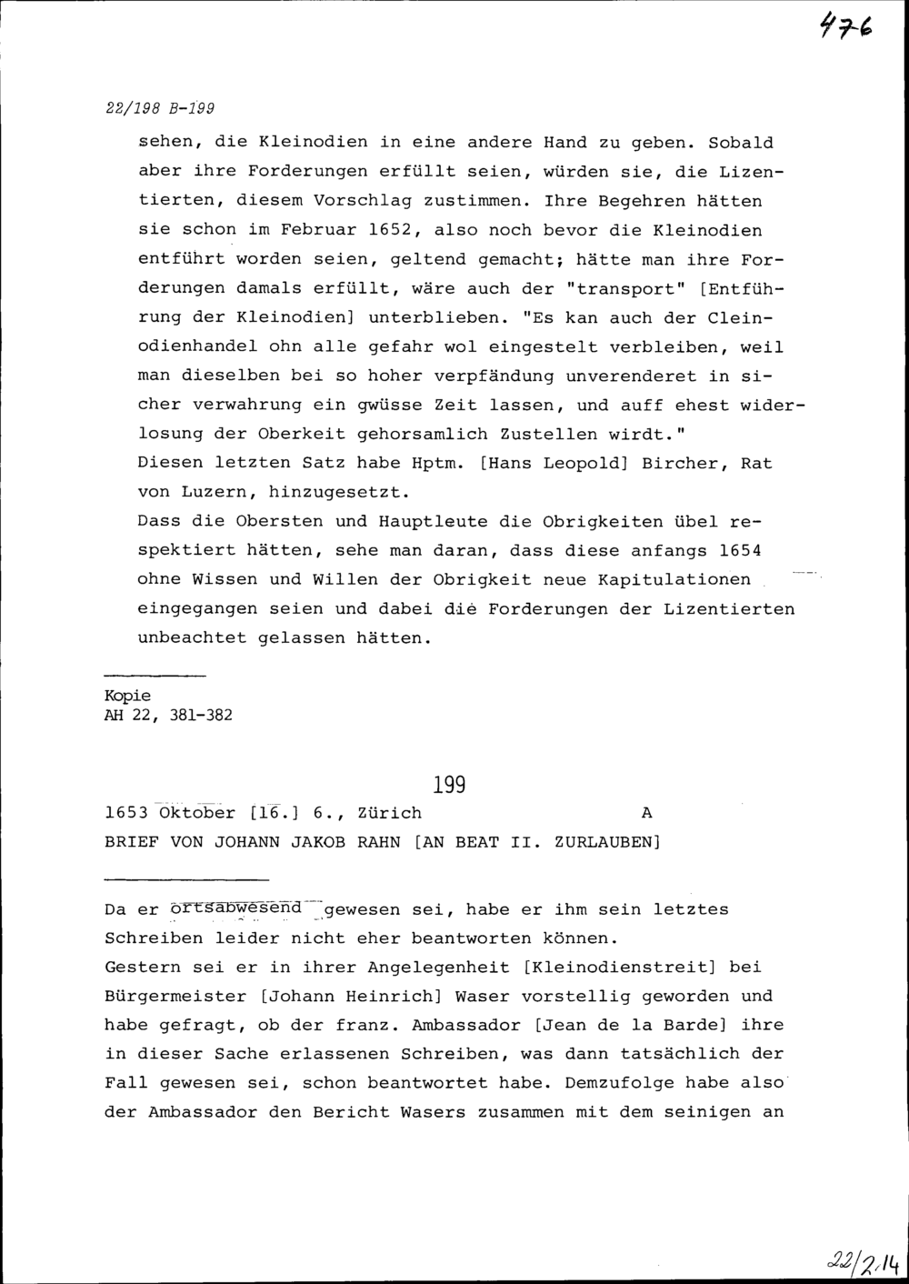Schreiben von Johann Jakob Rahn an Beat II. Zurlauben