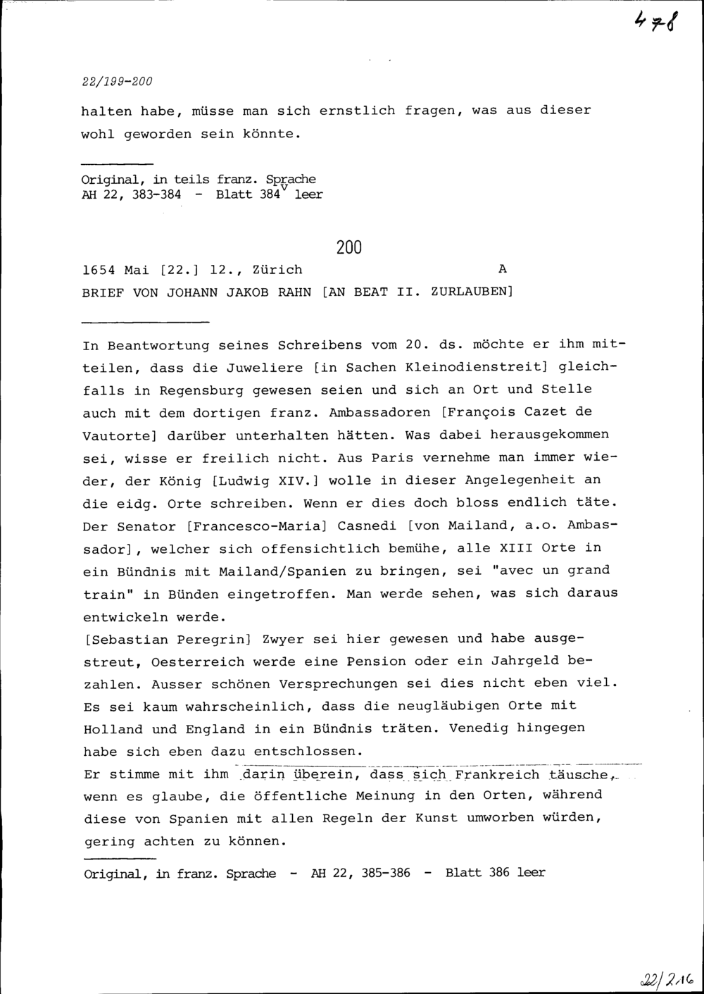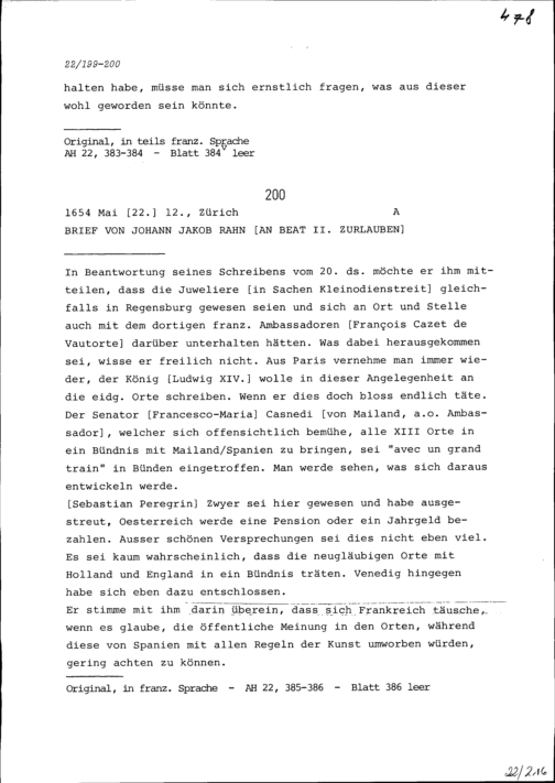 Schreiben von Johann Jakob Rahn an Beat II. Zurlauben