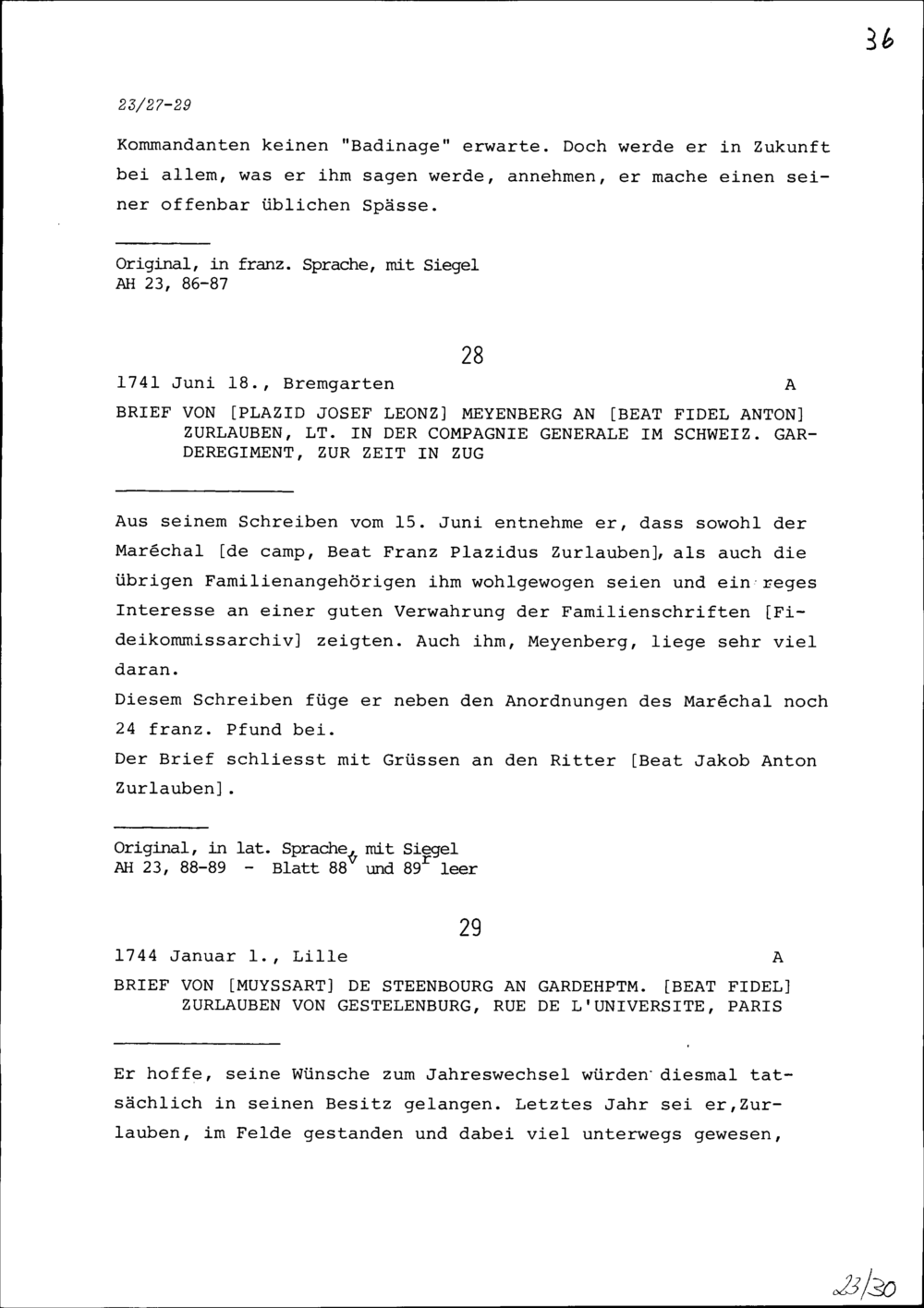 Schreiben von Plazid Josef Leonz Meyenberg an Beat Fidel Anton Zurlauben, Leutnant in der Kompanie im Schweizer Garderegiment, zur Zeit in Zug