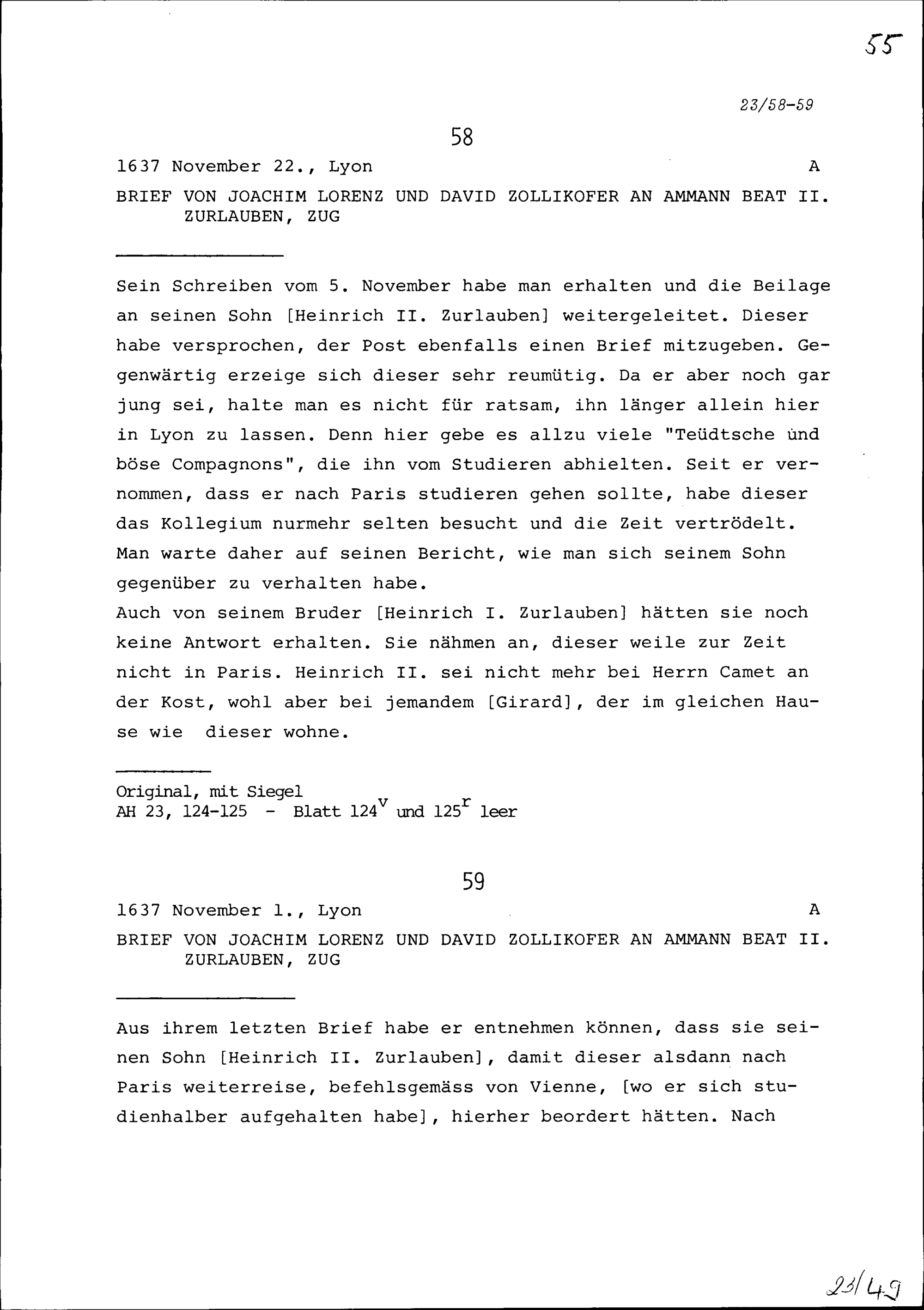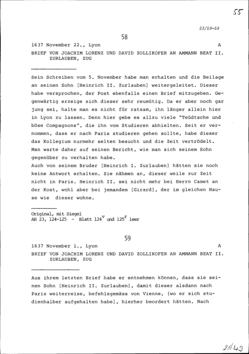 Schreiben von Joachim Lorenz und David Zollikofer an Beat II. Zurlauben, Ammann, Zug