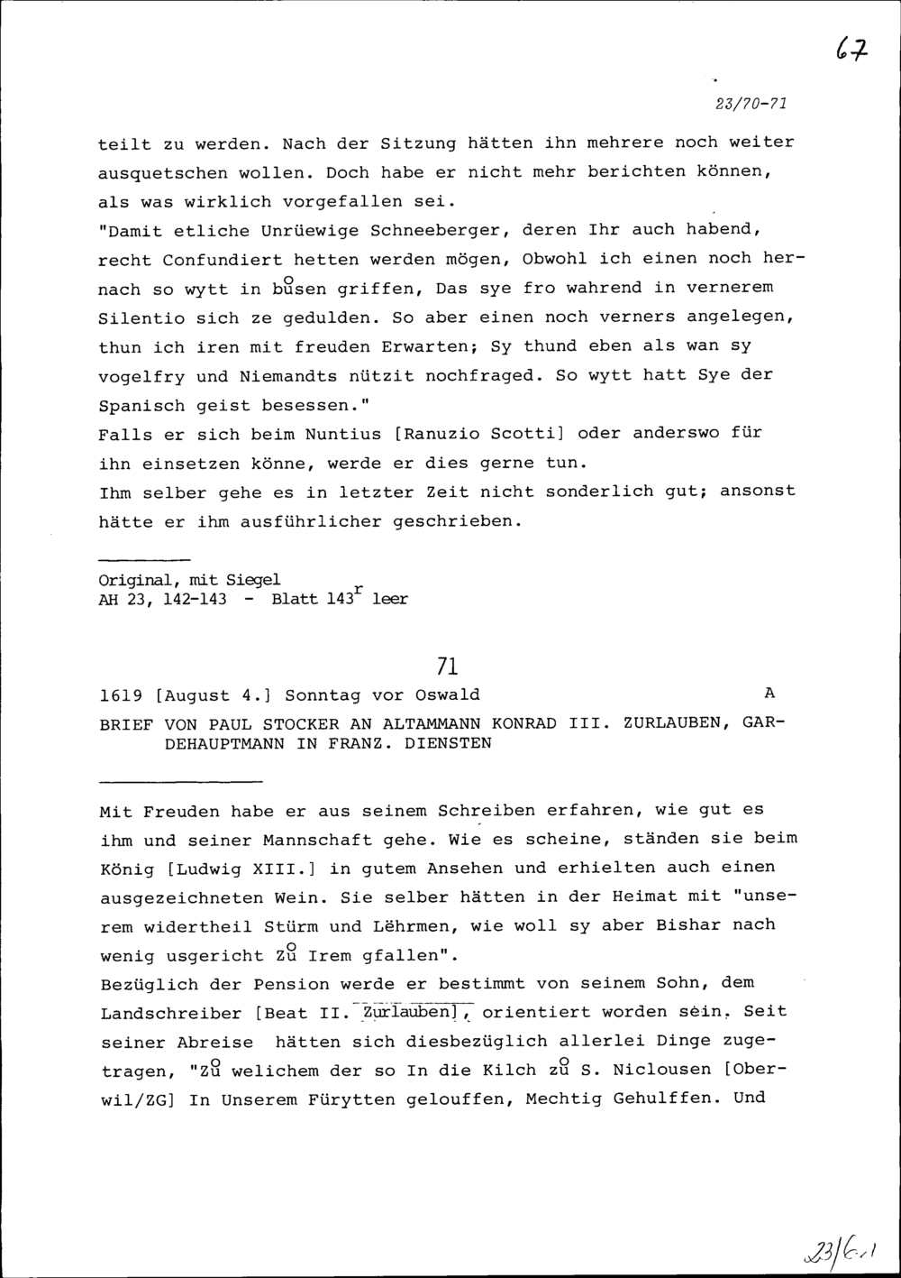 Schreiben von Paul Stocker an Konrad III. Zurlauben, Altammann und Gardehauptmann in französischen Diensten