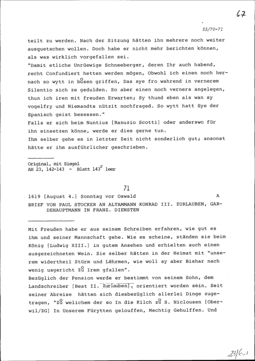 Schreiben von Paul Stocker an Konrad III. Zurlauben, Altammann und Gardehauptmann...