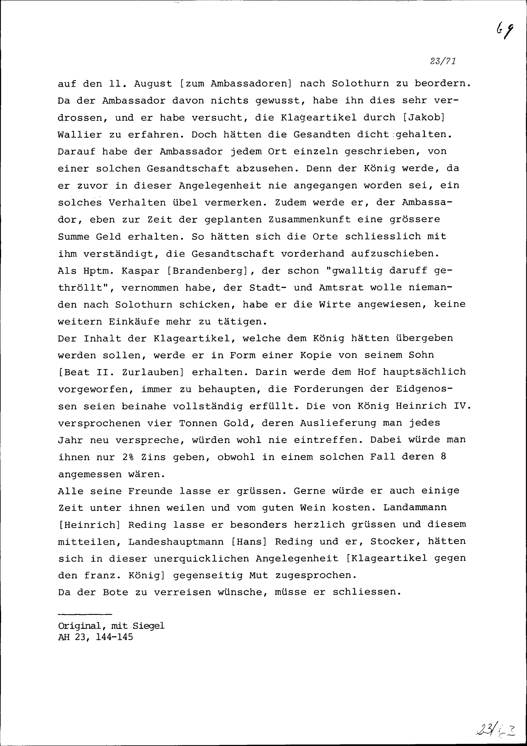 Schreiben von Paul Stocker an Konrad III. Zurlauben, Altammann und Gardehauptmann in französischen Diensten