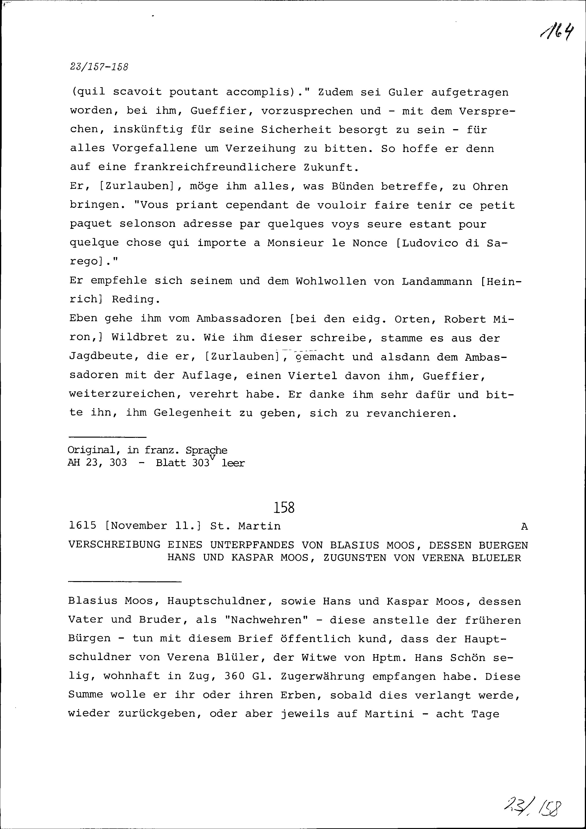Verschreibung eines Unterpfands von Blasius Moos, dessen Bürgen Hans und Kaspar Moos, zugunsten von Verena Blüler