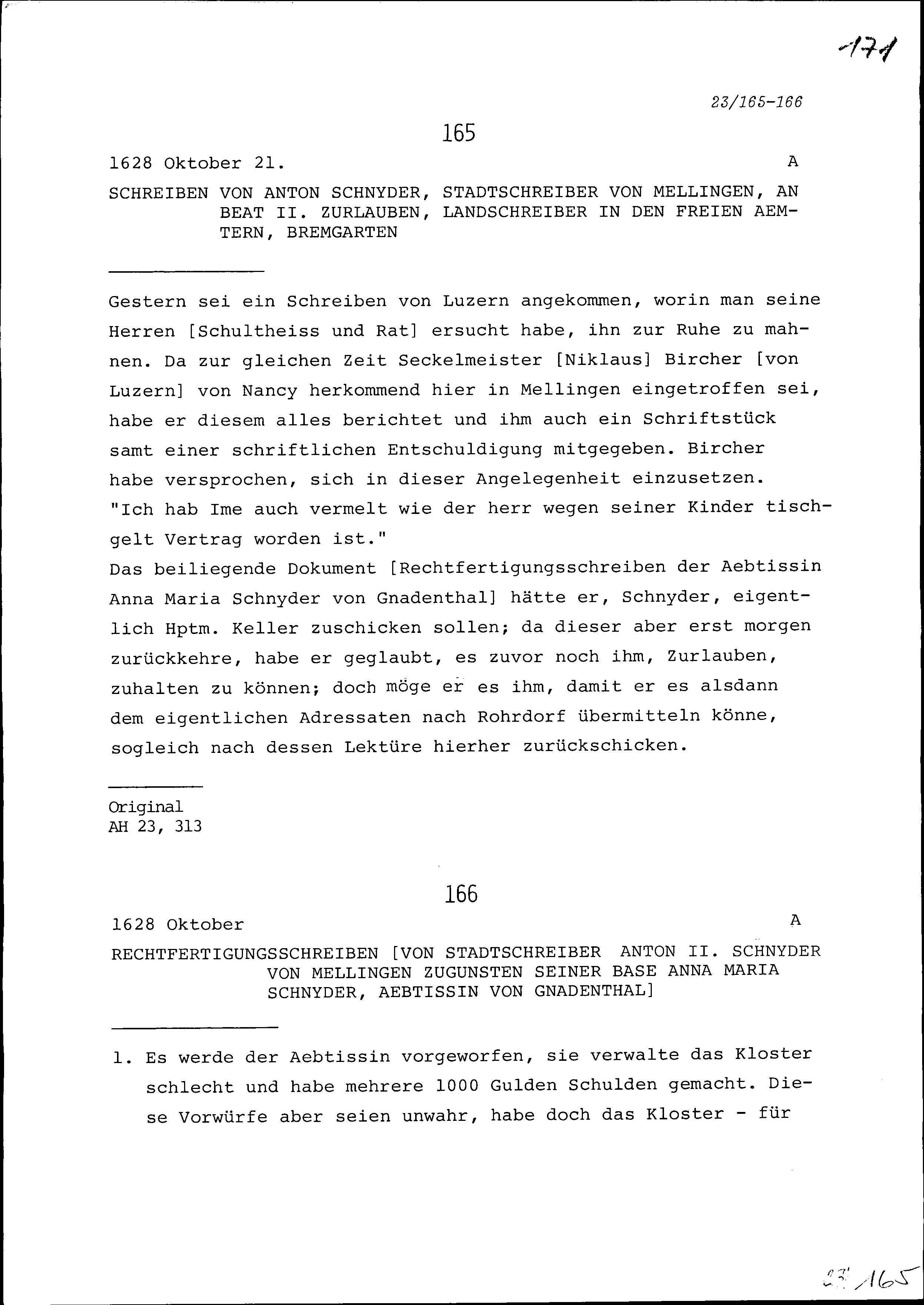 Schreiben von Anton Schnyder, Stadtschreiber von Mellingen, an Beat II. Zurlauben, Landschreiber in den Freien Ämter, Bremgarten