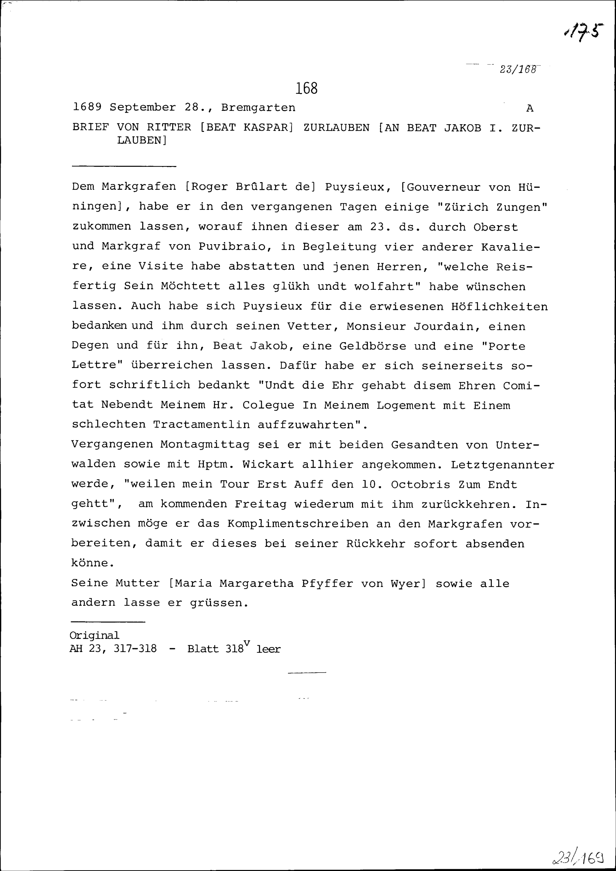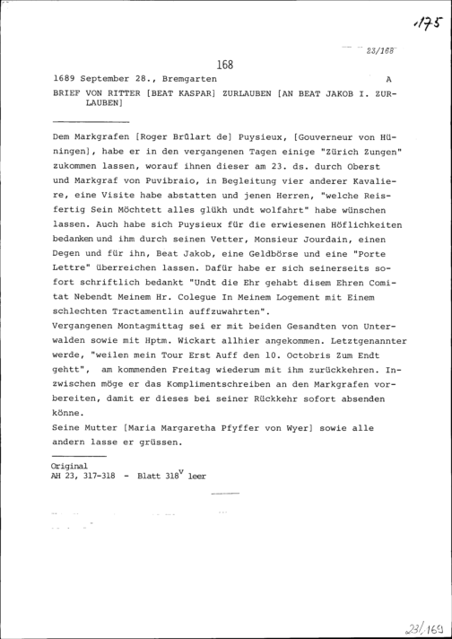 Schreiben von Beat Kaspar Zurlauben an Beat Jakob I. Zurlauben