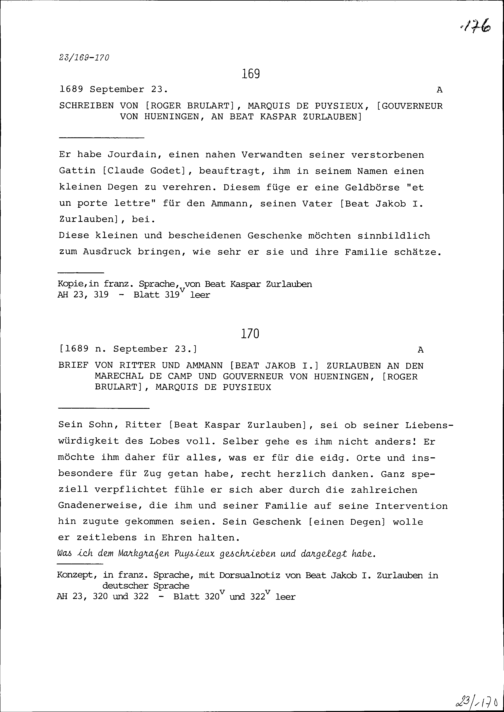 Schreiben von Roger Brûlart, Marquis de Puysieux, Gouverneur von Hüningen, an Beat Kaspar Zurlauben
