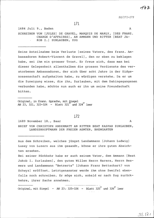 Schreiben von Jules de Gravel, Marquis de Marly, französischer Geschäftsträger (Charge d'affaires), an Beat Jakob I. Zurlauben, Ammann, Zug