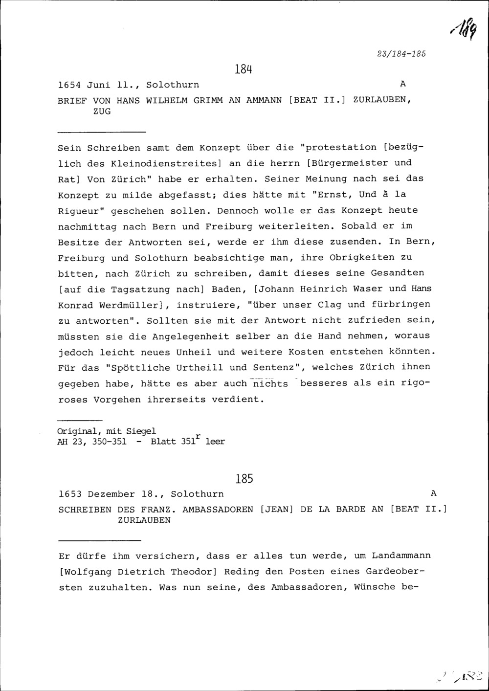Schreiben von Hans Wilhelm Grimm an Beat II. Zurlauben, Ammann, Zug
