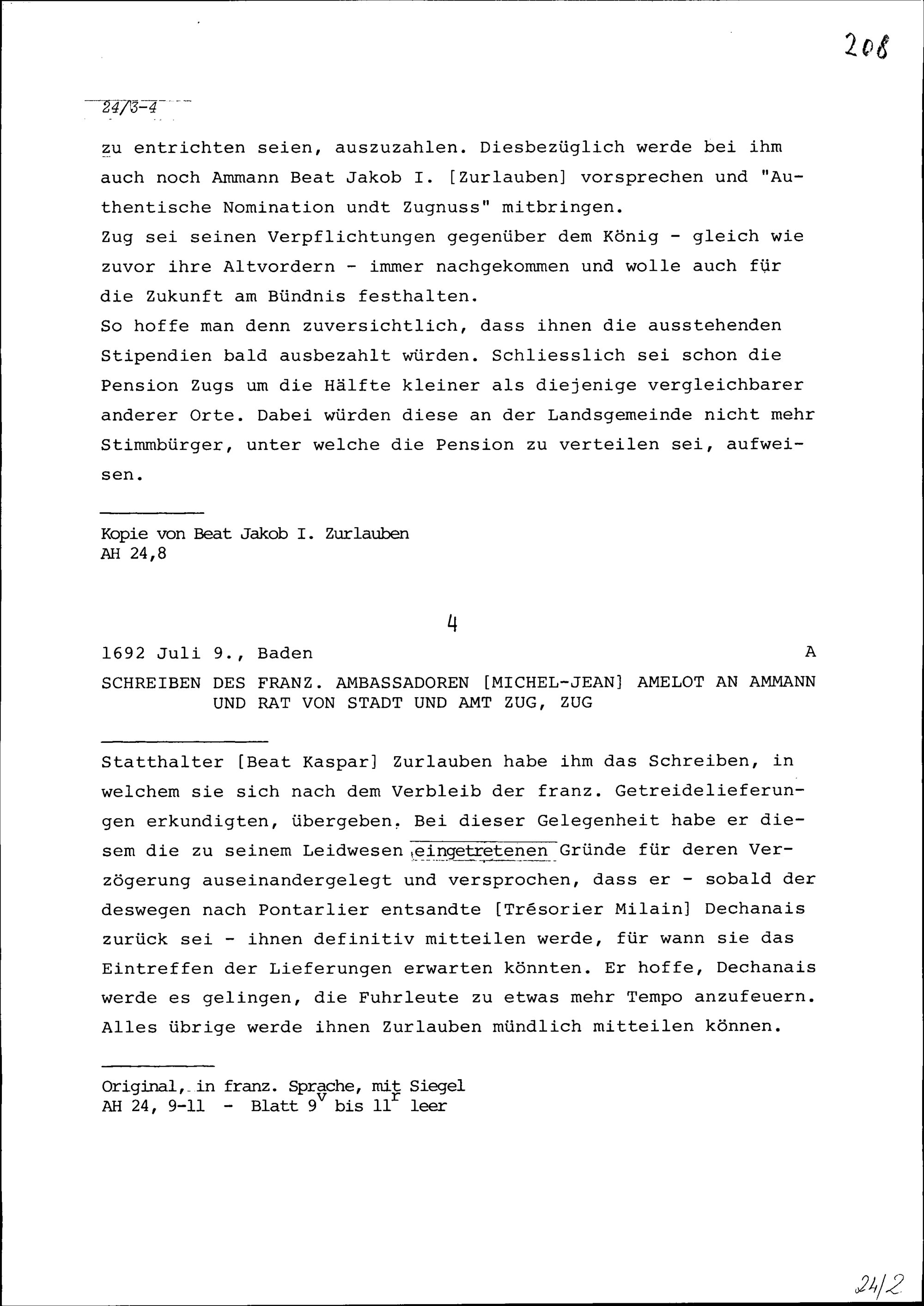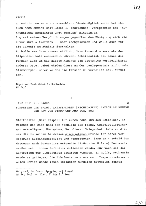 Schreiben von Michel-Jean Amelot, Ambassador von Frankreich, an Ammann und Rat von Stadt und Amt Zug, Zug