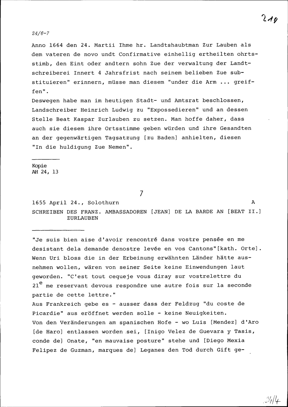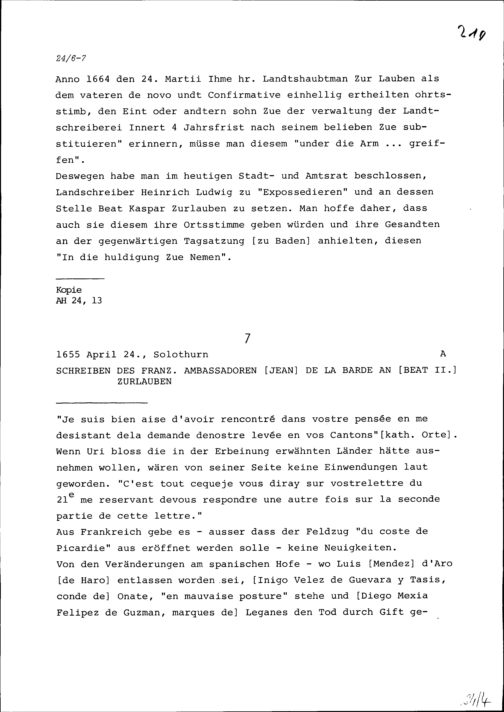 Schreiben von Jean de la Barde, Ambassador von Frankreich, an Beat II. Zurlauben
