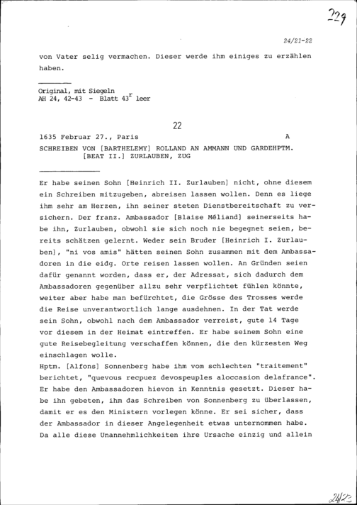 Schreiben von Barthélémy Rolland an Beat II. Zurlauben, Ammann und Gardehauptmann,...