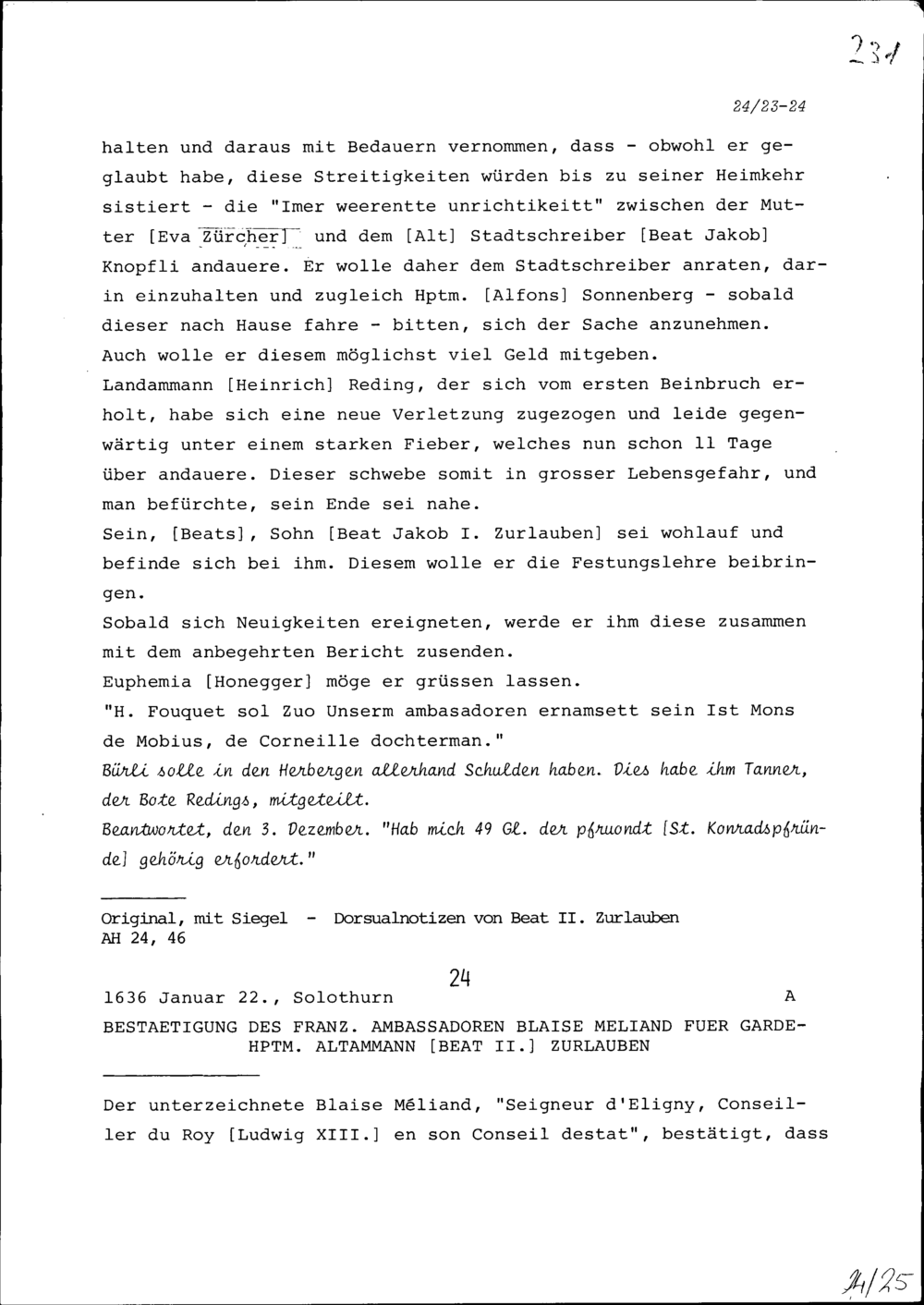 Bestätigung von Blaise Méliand, Ambassador von Frankreich, für Beat II. Zurlauben, Gardehauptmann und Altammann