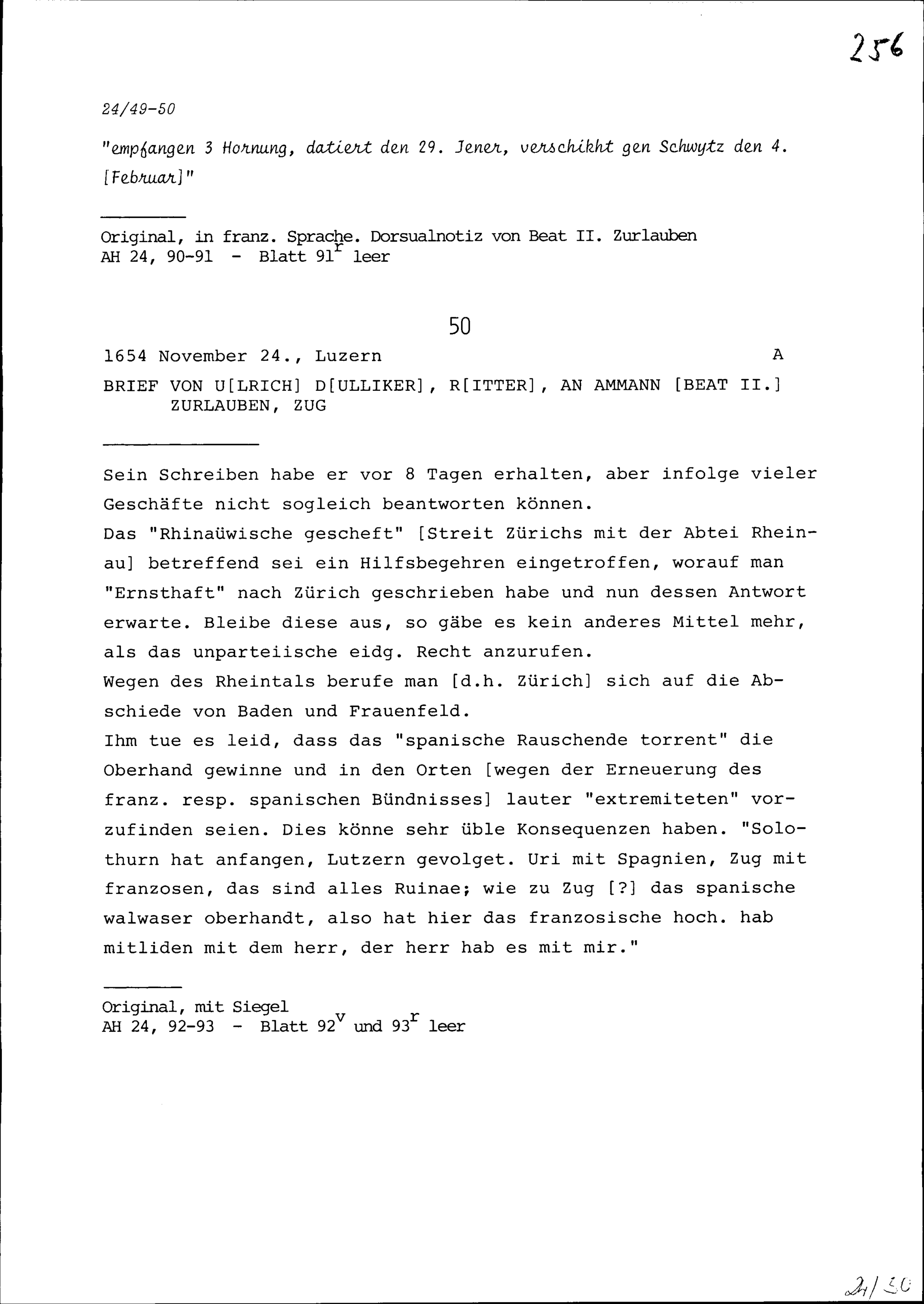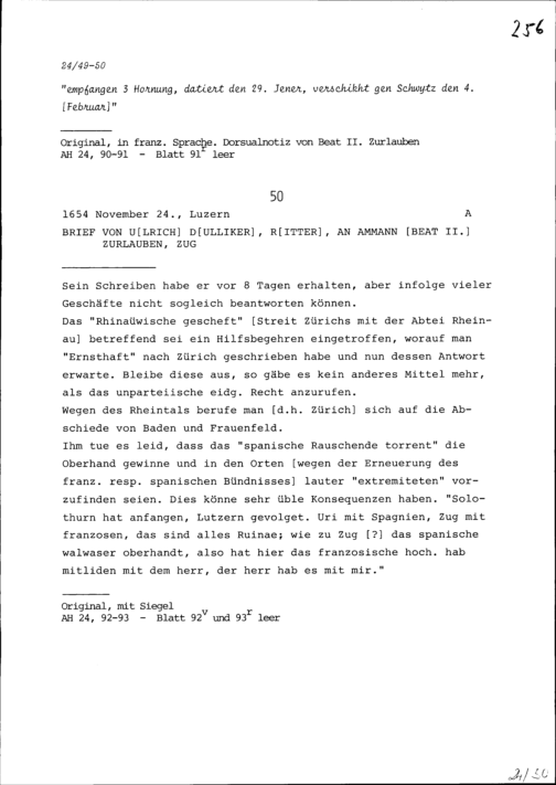 Schreiben von Ulrich Dulliker, an Beat II. Zurlauben, Ammann, Zug