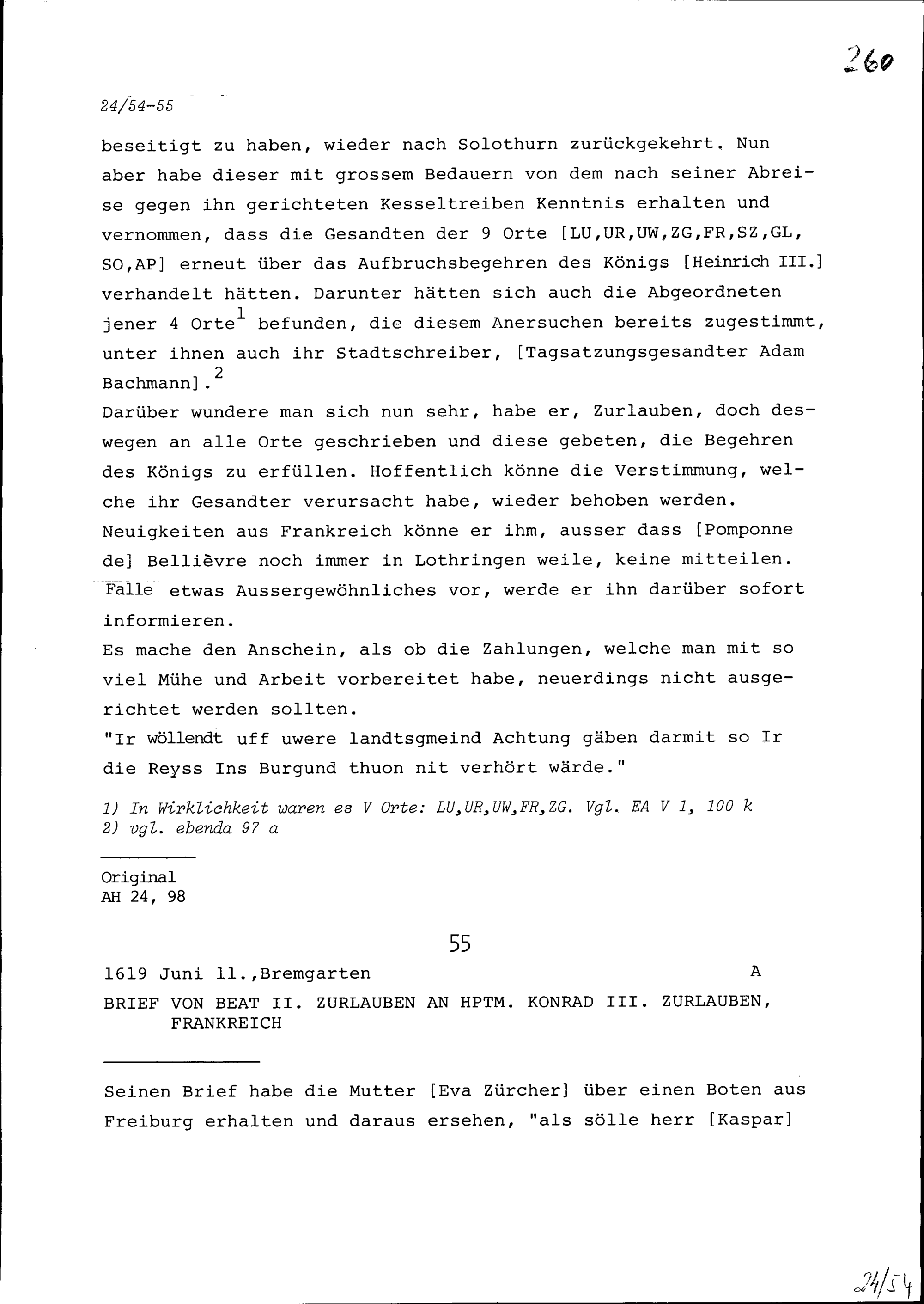 Schreiben von Beat II. Zurlauben an Konrad III. Zurlauben, Hauptmann, Frankreich
