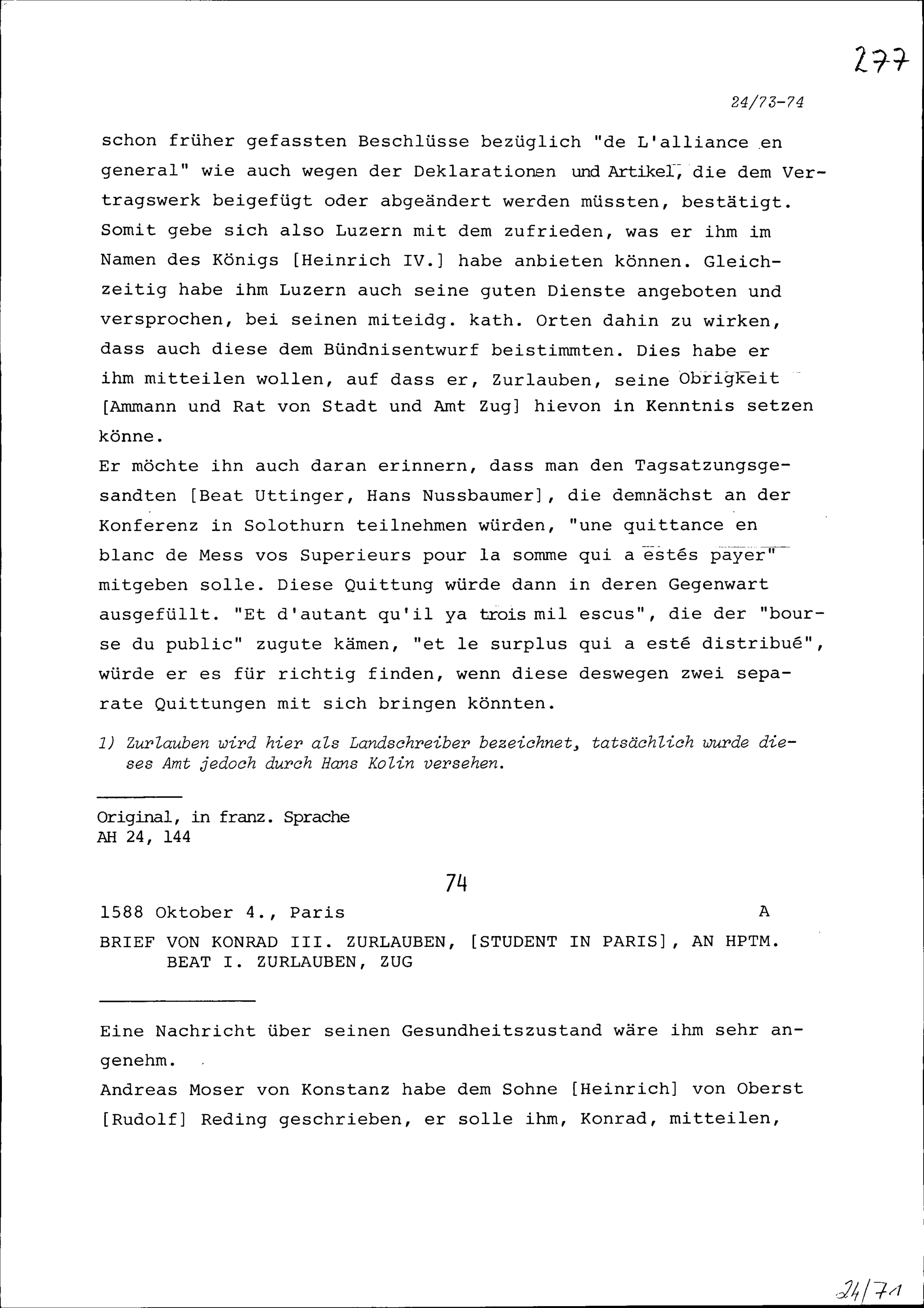 Schreiben von Konrad III. Zurlauben, Student, Paris, an Beat I. Zurlauben, Hauptmann, Zug