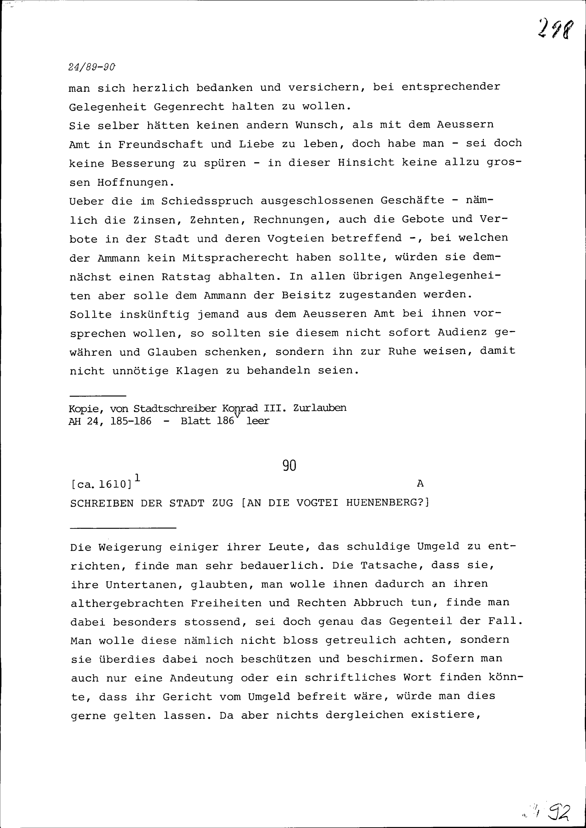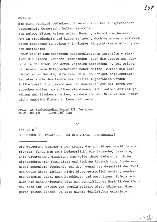 Schreiben der Stadt Zug an die Vogtei Hünenberg