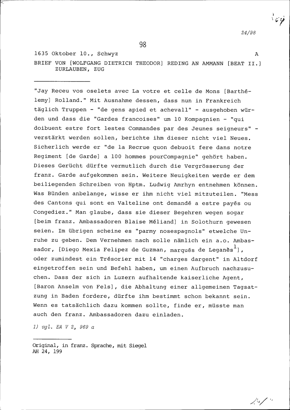 Schreiben von Wolfgang Dietrich Theodor Reding an Beat II. Zurlauben, Ammann, Zu...