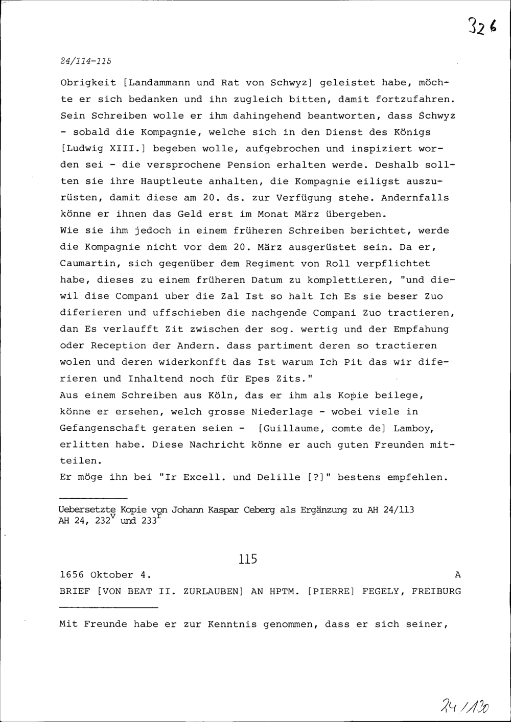Schreiben von Beat II. Zurlauben an Pierre Fégely, Hauptmann, Freiburg