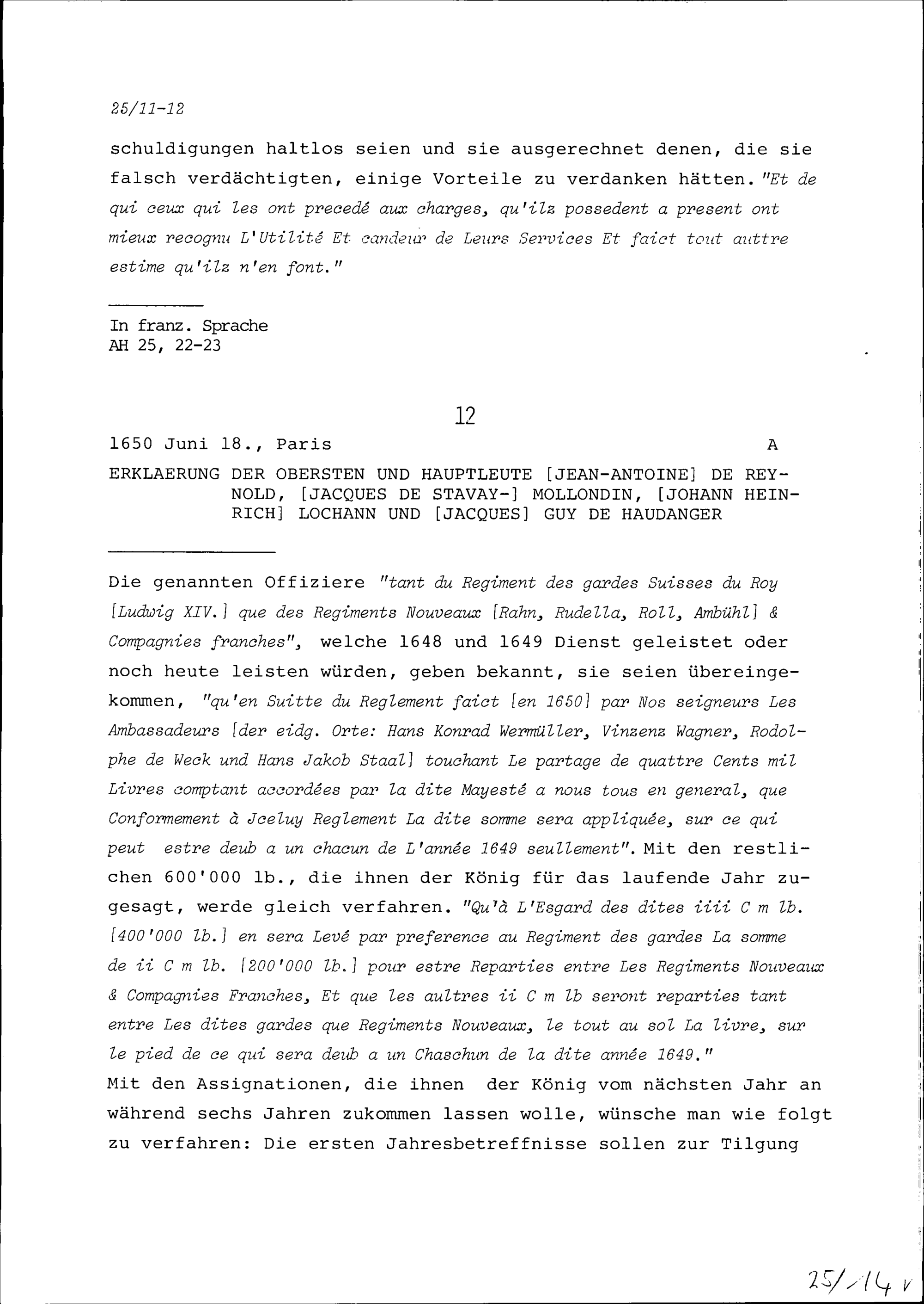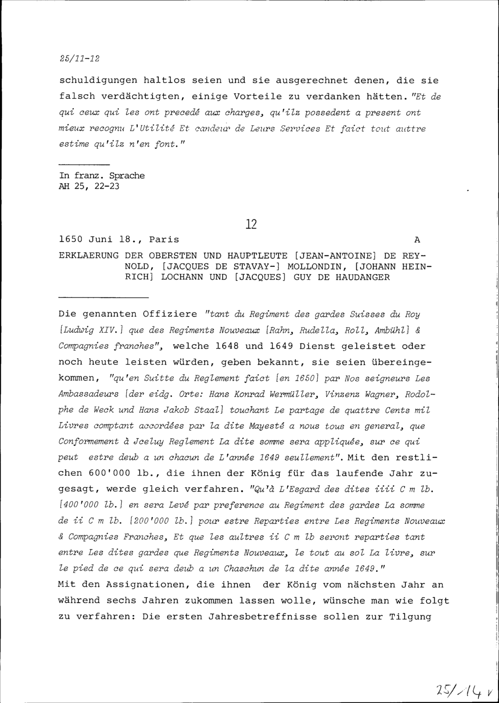 Erklärung von Jean-Antoine de Reynold, von Jacques de Stavay-Mollondin, von Johann Heinrich Lochann und von Jacques Guy de Haudanger, Oberste und Hauptleute