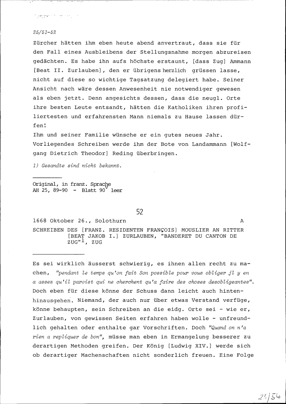 Schreiben von François Mouslier, Resident von Frankreich, an Beat Jakob I. Zurlauben, Zug