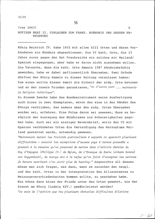 Notiz von Beat II. Zurlauben zum französischen Bündnis und dessen Erneuerung