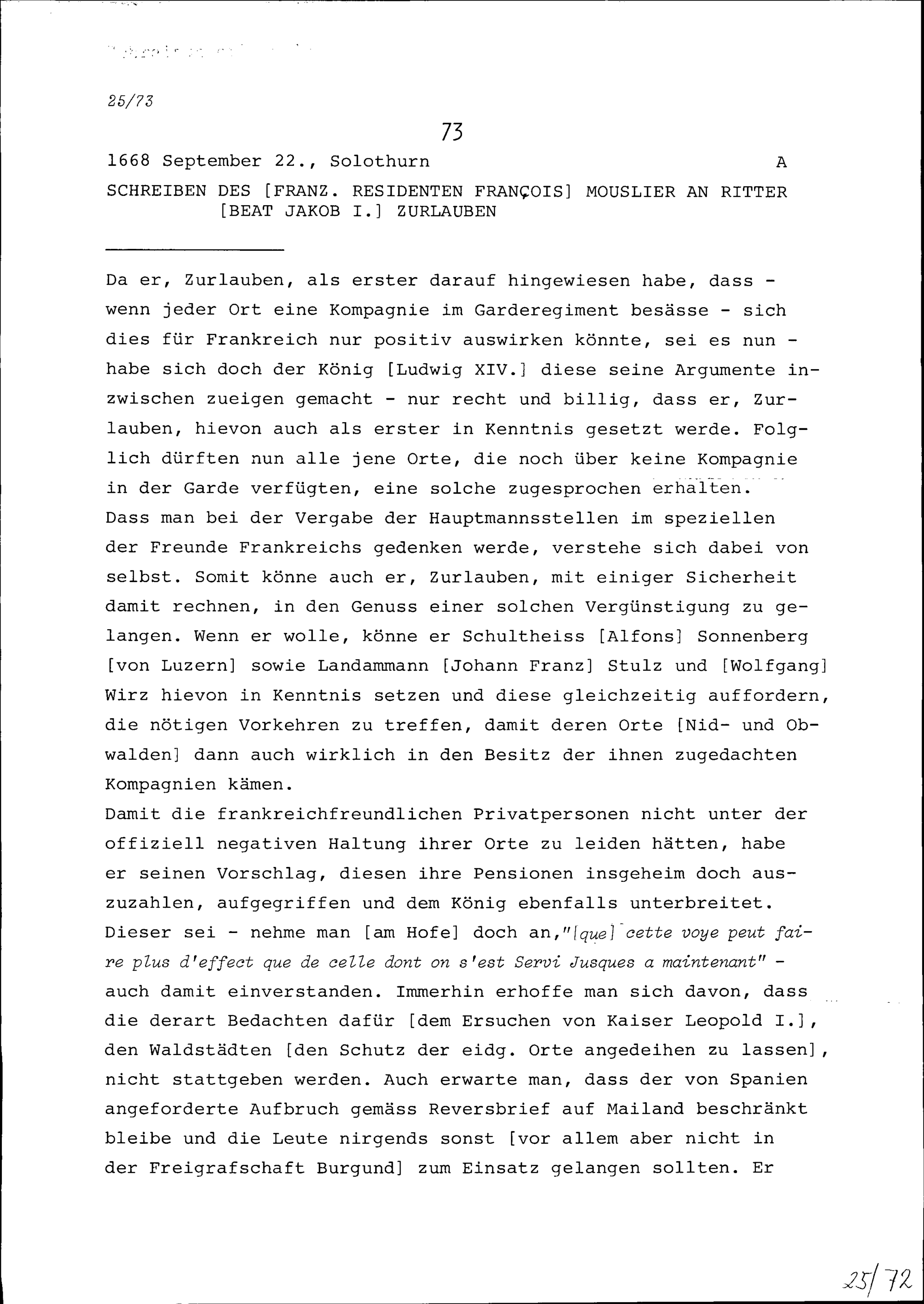Schreiben von François Mouslier, Resident von Frankreich, an Beat Jakob I. Zurlauben