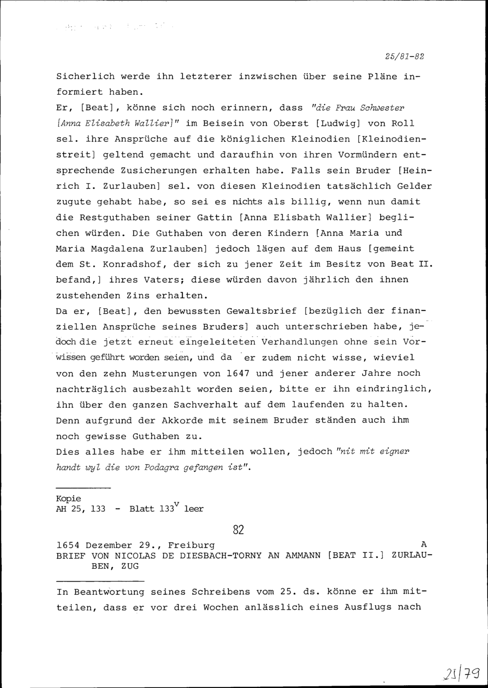 Schreiben von Nicolas de Diesbach-Torny an Beat II. Zurlauben, Ammann, Zug