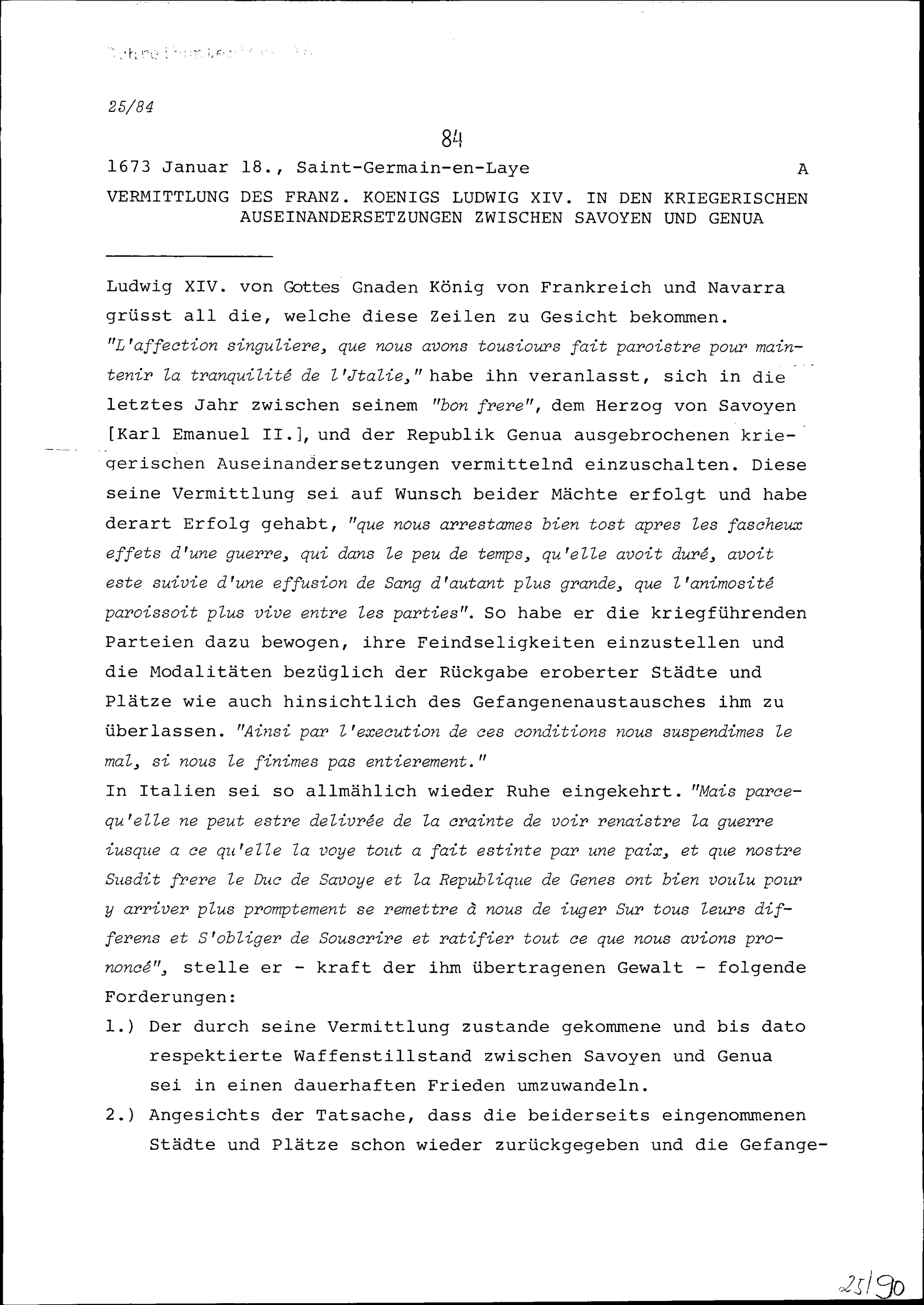Vermittlung von Ludwig XIV., König von Frankreich, in den kriegerischen Auseinandersetzungen zwischen Savoyen und Genua