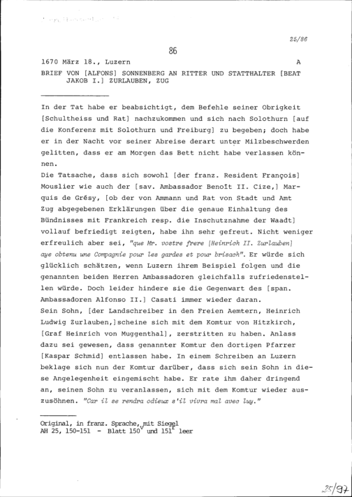 Schreiben von Alfons von Sonnenberg an Beat Jakob I. Zurlauben, Statthalter, Zug
