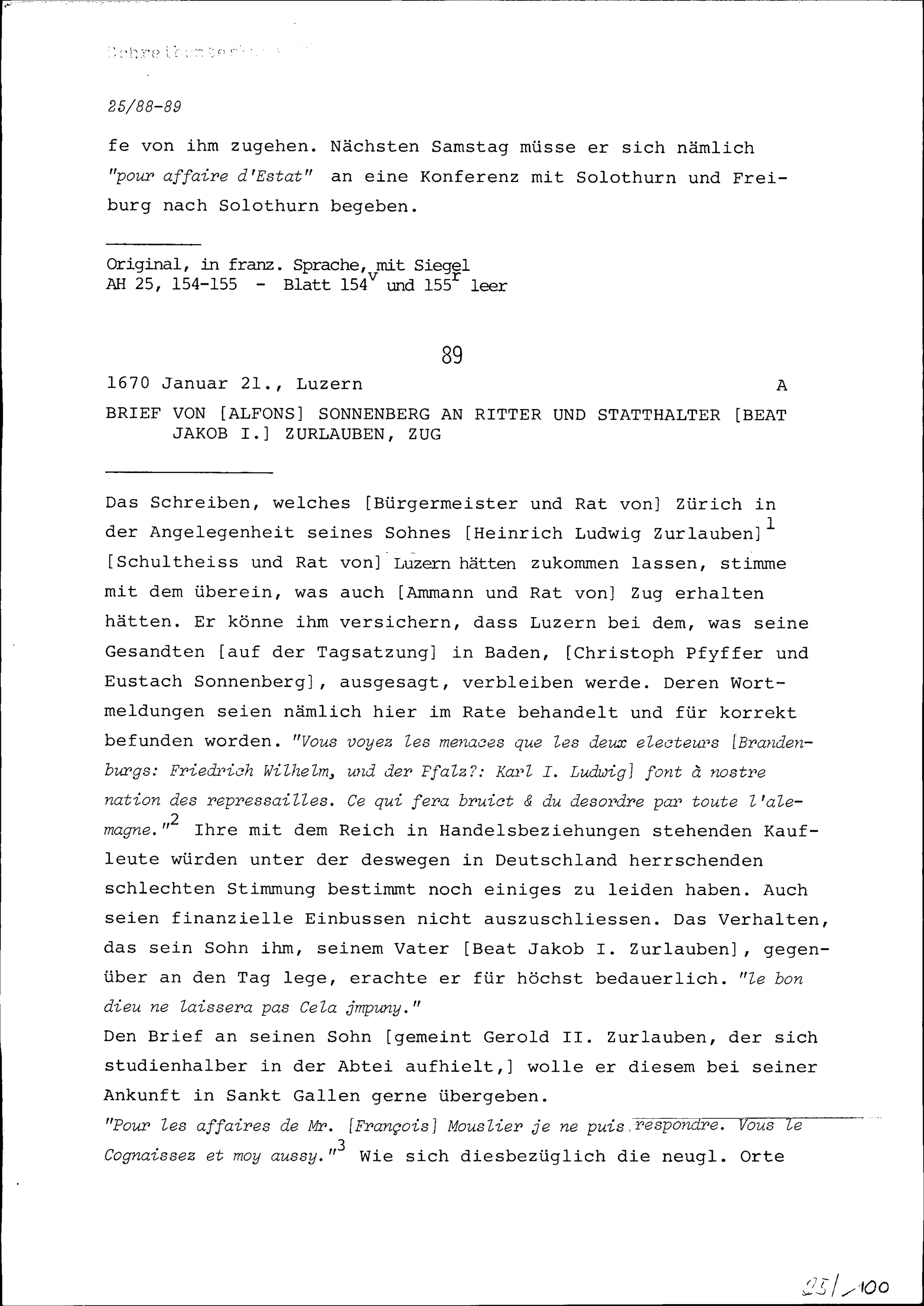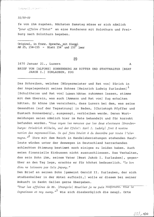 Schreiben von Alfons von Sonnenberg an Beat Jakob I. Zurlauben, Statthalter, Zug