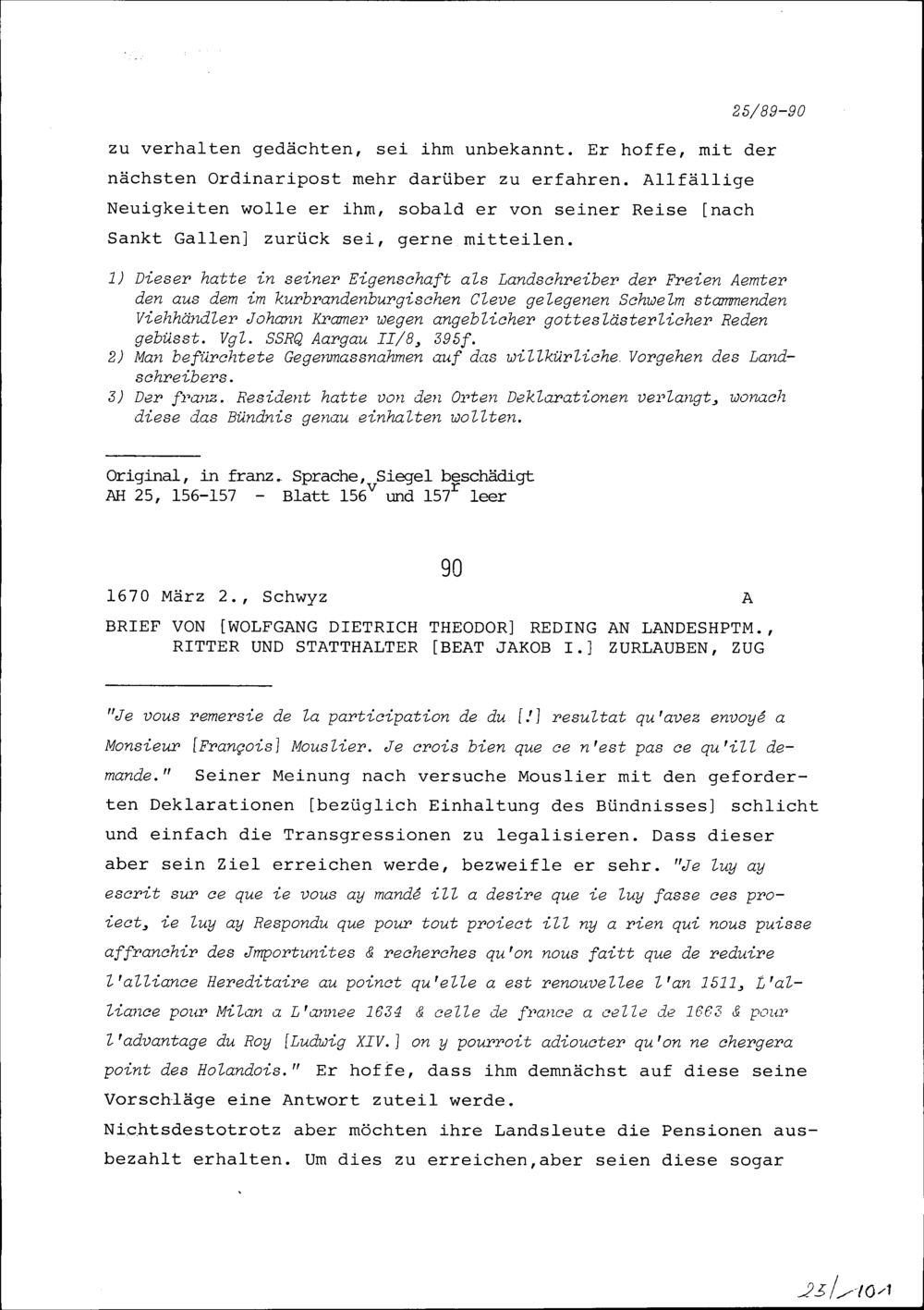 Schreiben von Wolfgang Dietrich Theodor Reding an Beat Jakob I. Zurlauben, Landeshauptmann...
