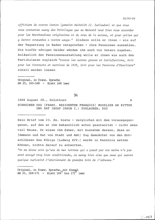 Schreiben von François Mouslier, Resident von Frankreich, an Beat Jakob I. Zurlauben, Rat, Zug