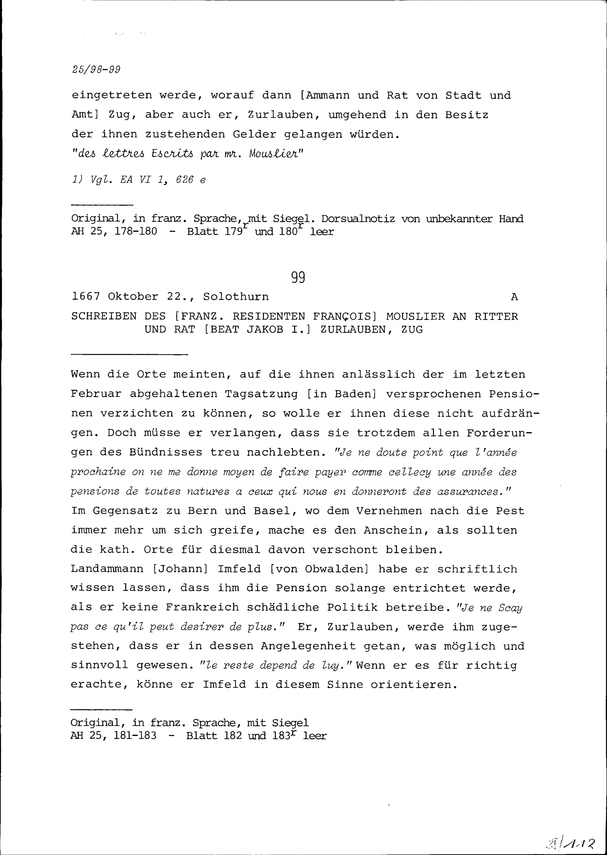 Schreiben von François Mouslier, Resident von Frankreich, an Beat Jakob I. Zurlauben, Rat, Zug