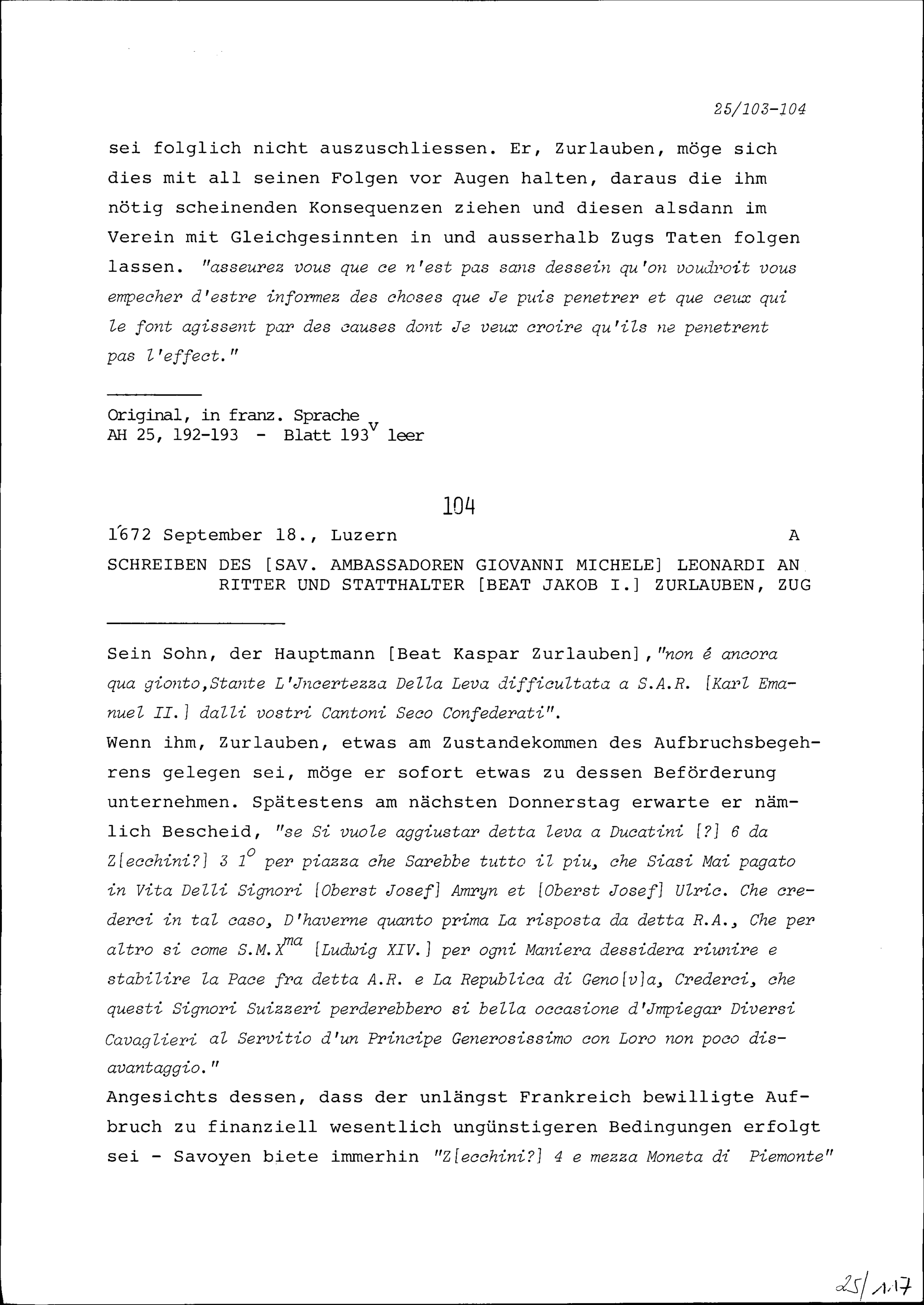 Schreiben von Giovanni Michele Leonardi, Ambassador von Savoyen, an Beat Jakob I. Zurlauben, Statthalter, Zug