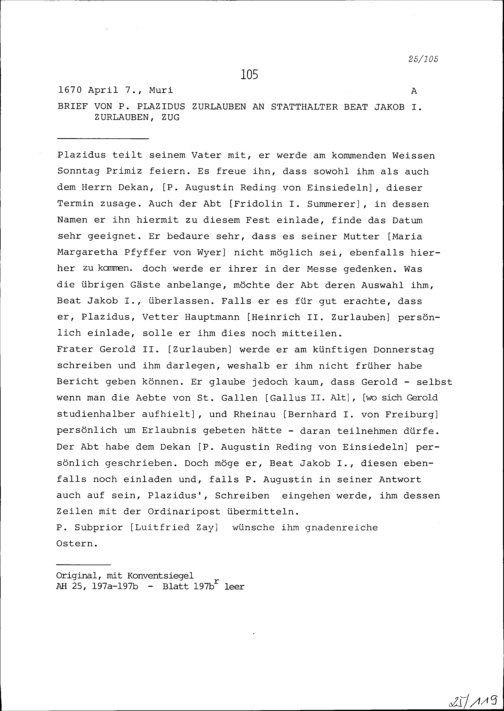 Schreiben von Plazidus Zurlauben, Konventuale, an Beat Jakob I. Zurlauben, Statthalter, Zug