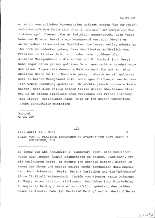 Schreiben von Plazidus Zurlauben, Konventuale, an Beat Jakob I. Zurlauben, Statthalter, Zug