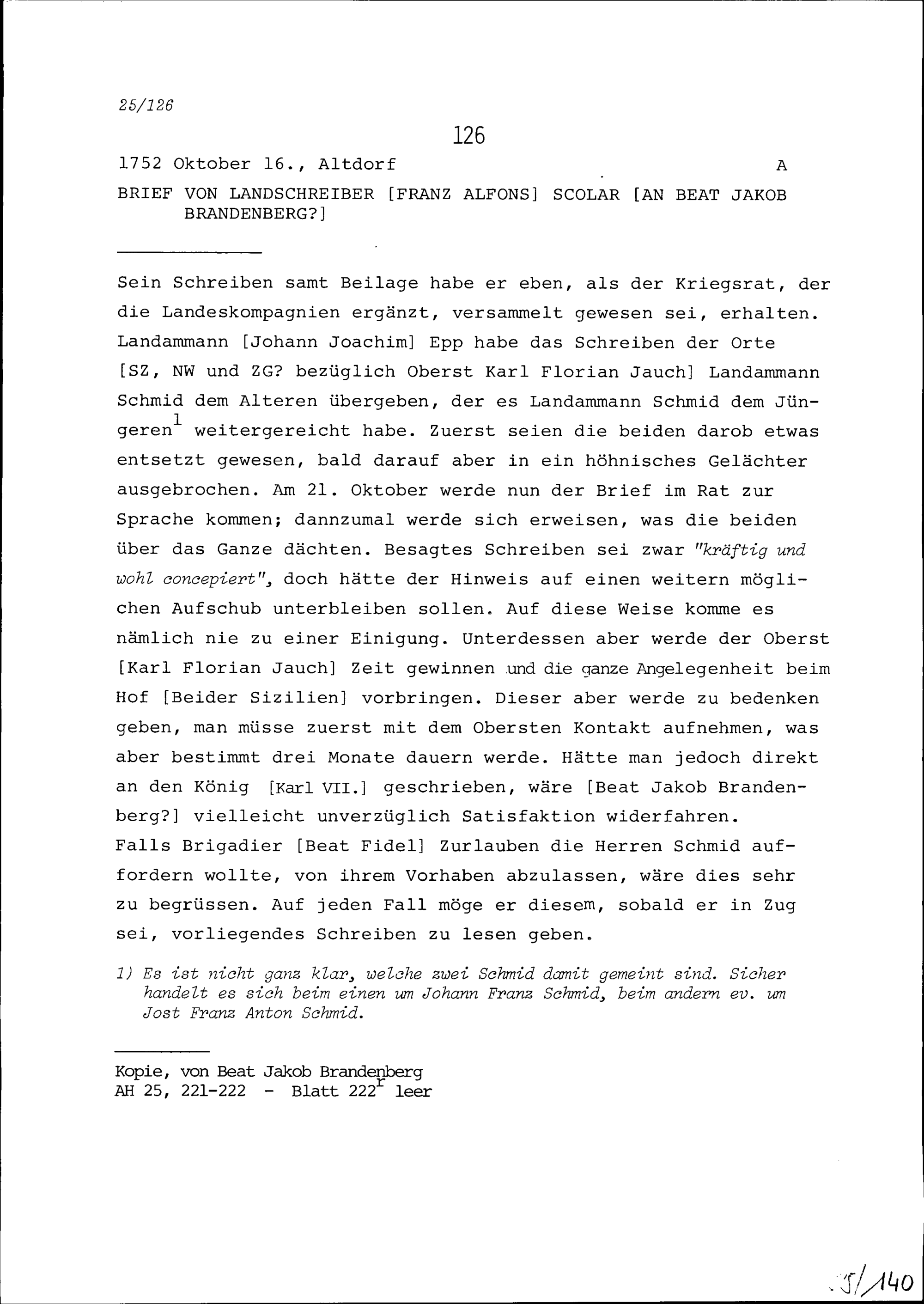 Schreiben von Franz Alfons Scolar, Landschreiber, an Beat Jakob Brandenberg