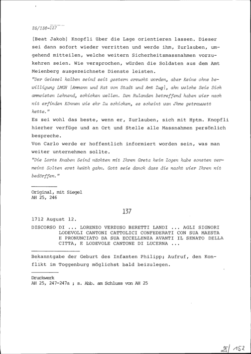 Druck: Discorso di […] Lorenzo Verzuso Beretti-Landi […] agli signori lodevoli cantoni cattolici confederati con sua maesta e pronunciato da sua eccellenza avanti il senato della citta, e lodevole canone die Luceren […]