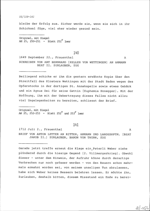 Schreiben von Bernhard Keller, Abt von Wettingen, an Beat II. Zurlauben, Ammann, Zug